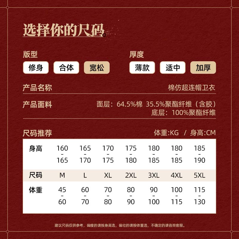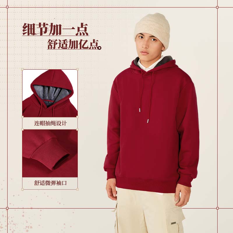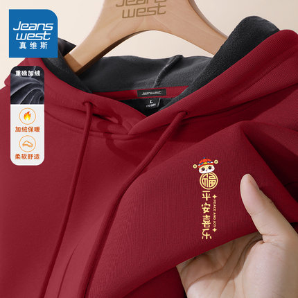 NN真维斯本命年卫衣男士冬季加绒保暖连帽外套青少年宽松红色上衣