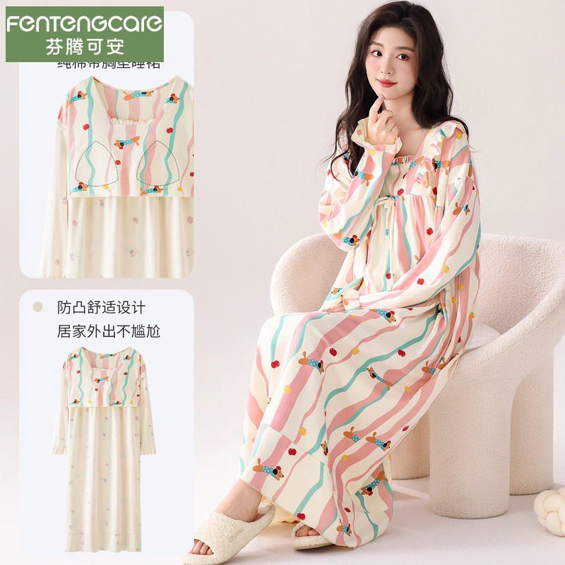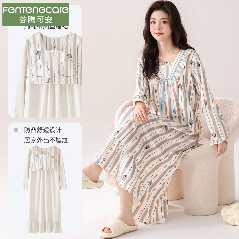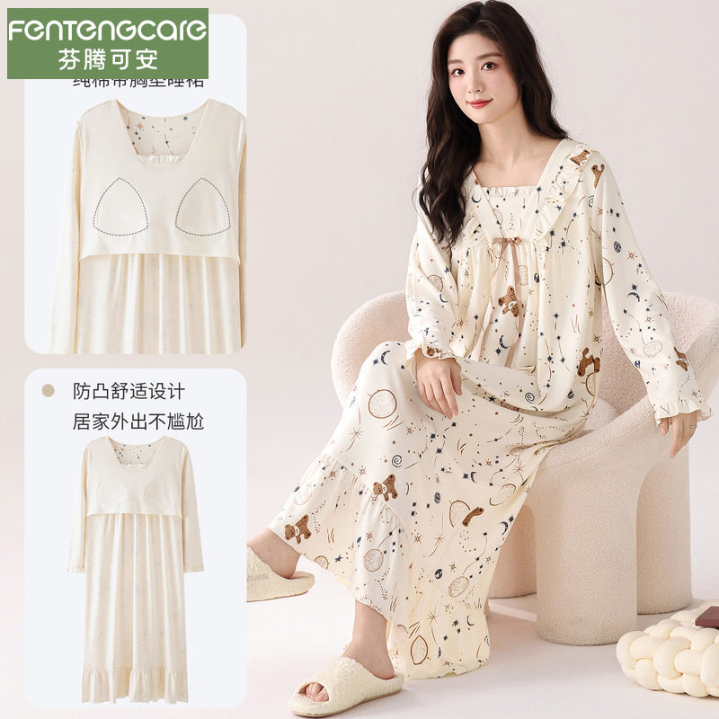 芬腾可安纯棉睡裙女睡衣秋冬季长袖2025新款甜美公主风带胸垫长裙