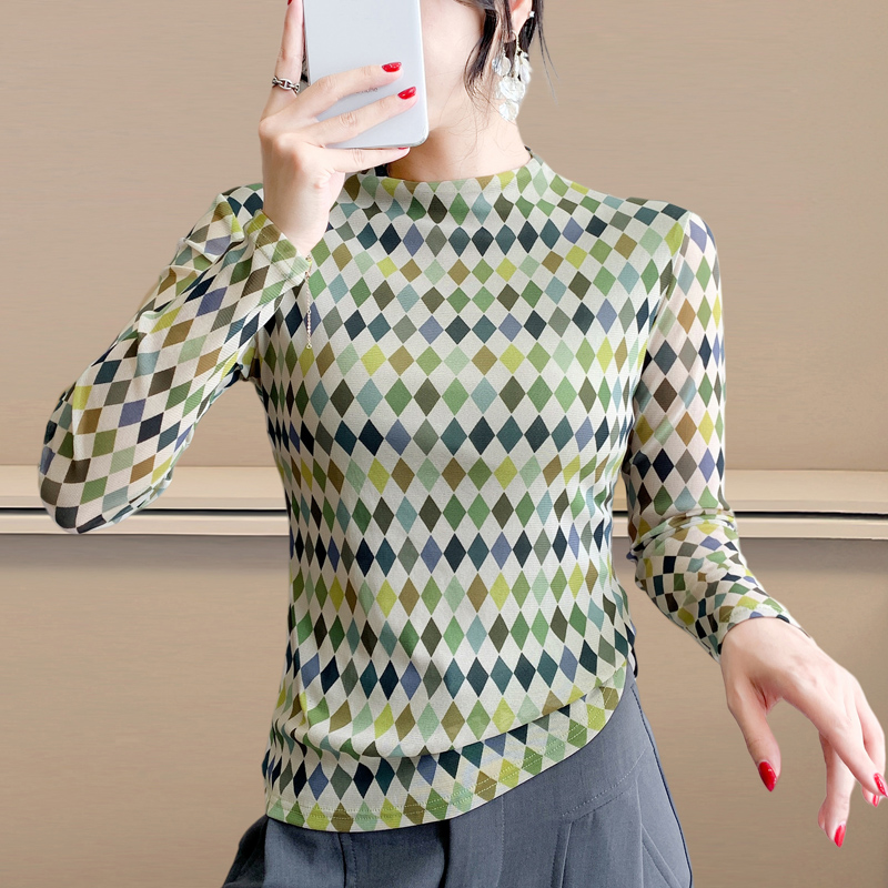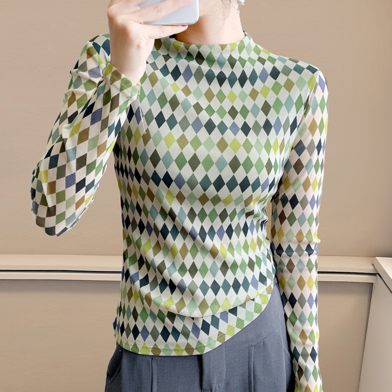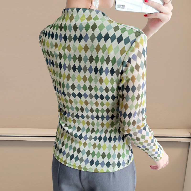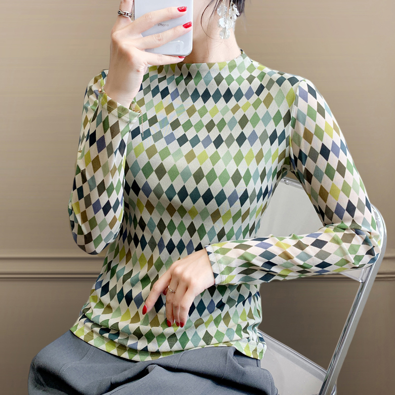 半高领格子网纱长袖打底衫女士秋冬新款百搭显瘦T恤上衣洋气小衫