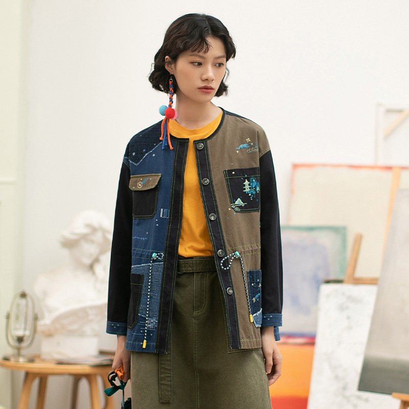 非鱼牛仔拼接风衣外套女中长款秋冬宽松设计感小众休闲刺绣潮上衣