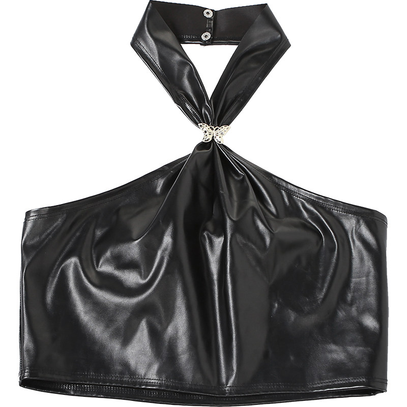 SylCue挂脖式PU皮吊带背心女修身美背露脐性感短款上衣夏季辣妹风