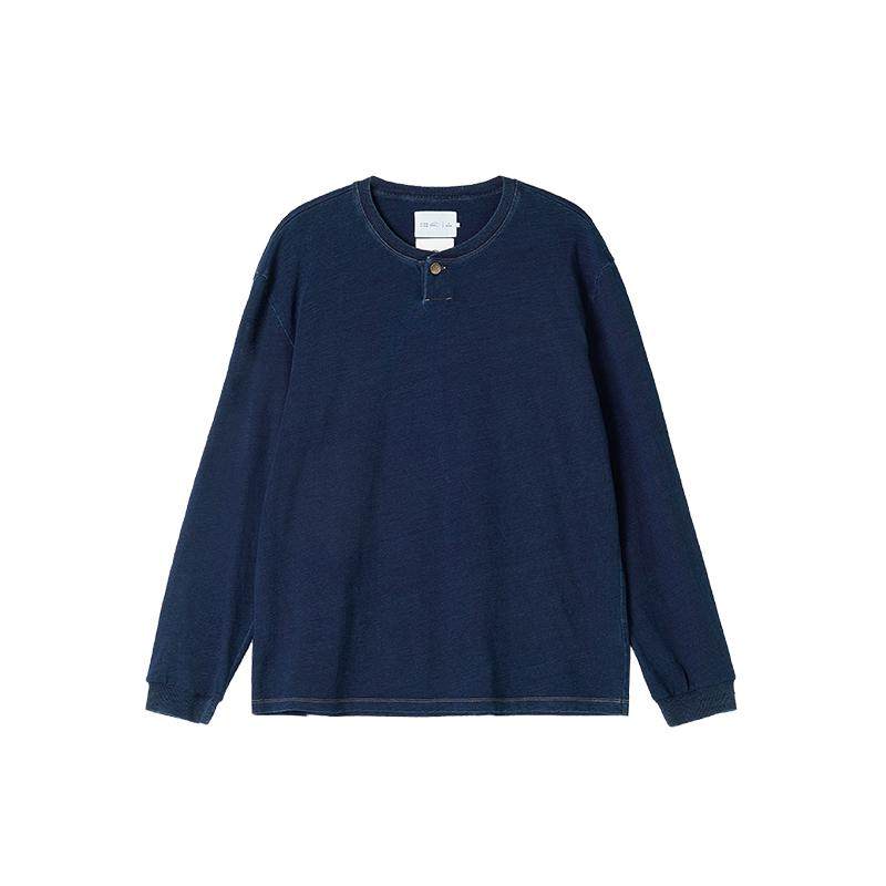 环保棉靛蓝染竹节一粒扣长袖T恤