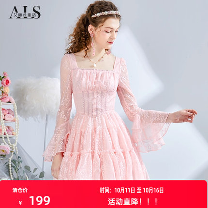 艾丽丝2025秋季新款甜美红色蕾丝连衣裙粉色刺绣方领短款仙女裙女