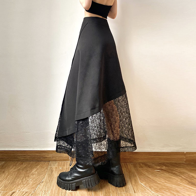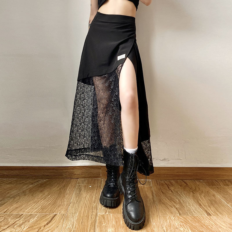 gagaopt设计感透视蕾丝拼接不规则开叉露腿半身裙高腰显瘦A字长裙