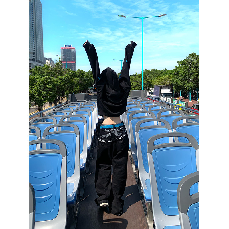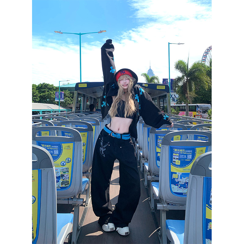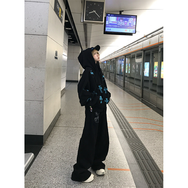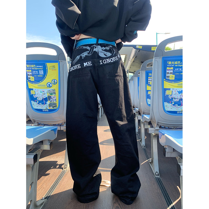 JMJ 美式复古设计感刀叉字母印花牛仔裤男女宽松百搭潮流直筒长裤