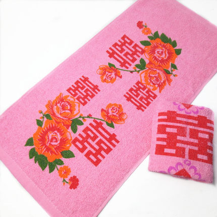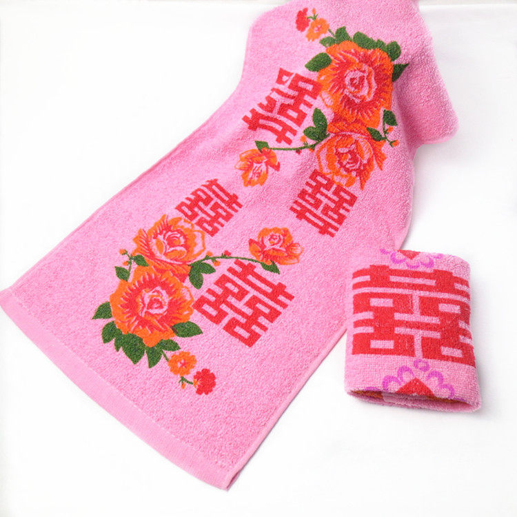 纯棉印花毛巾婚庆喜字粉红色礼品老式回礼面巾印花卡通花朵毛巾棉