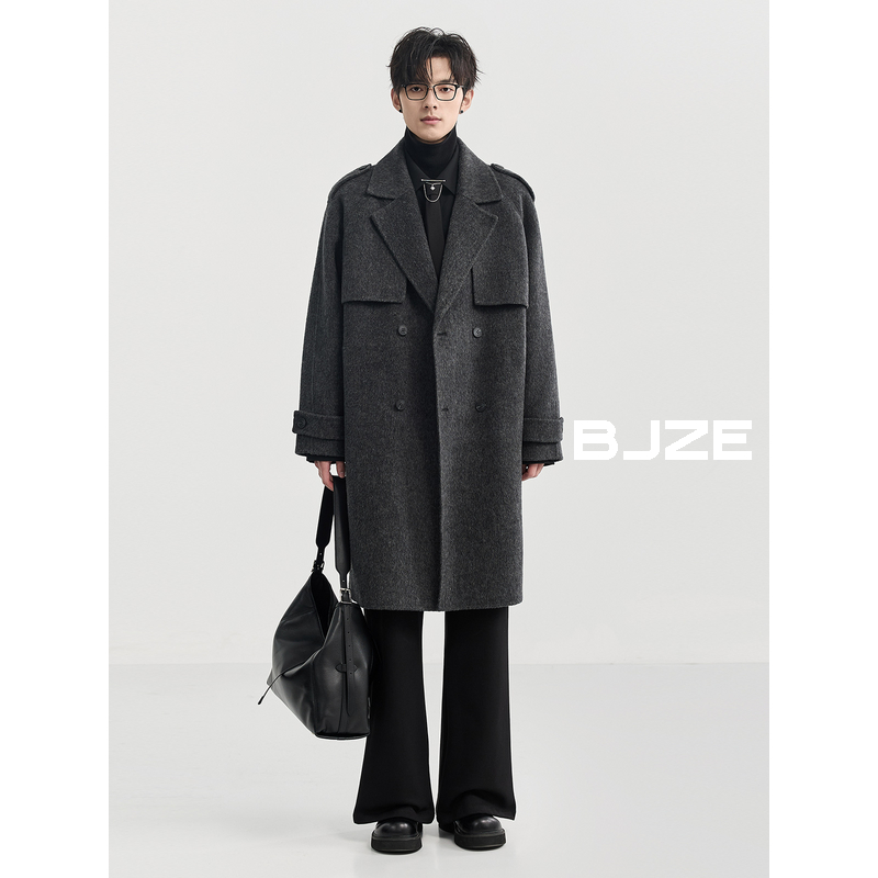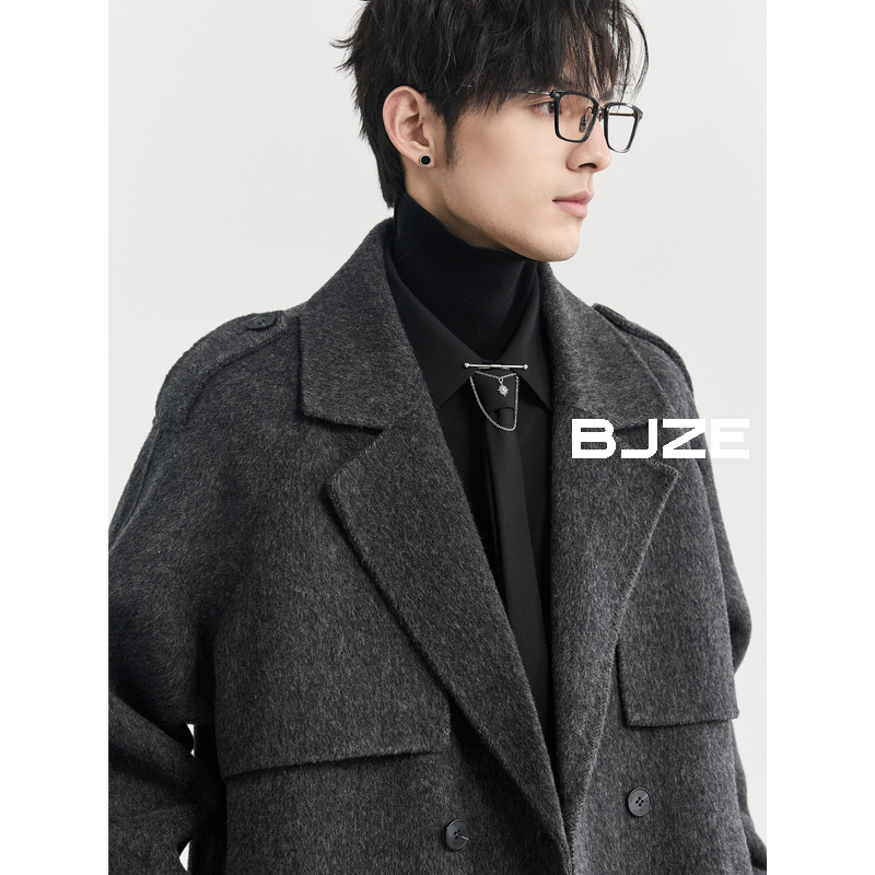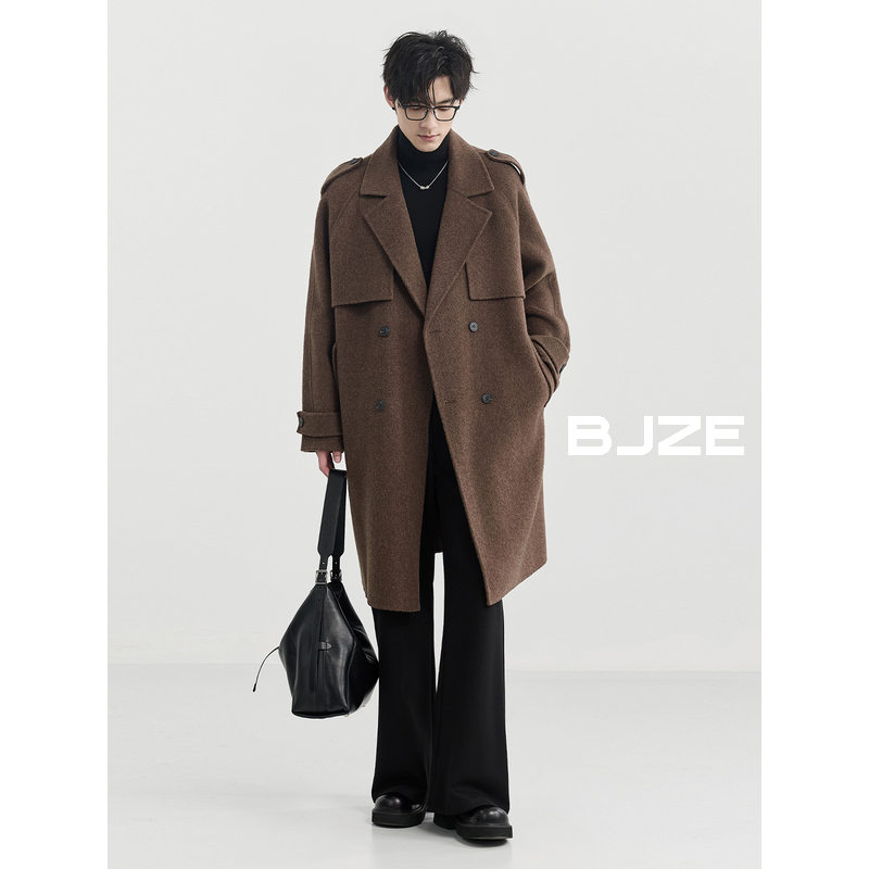 BJZE男装24冬季定织骆驼绒双面羊毛呢大衣男生中长款加厚宽松外套