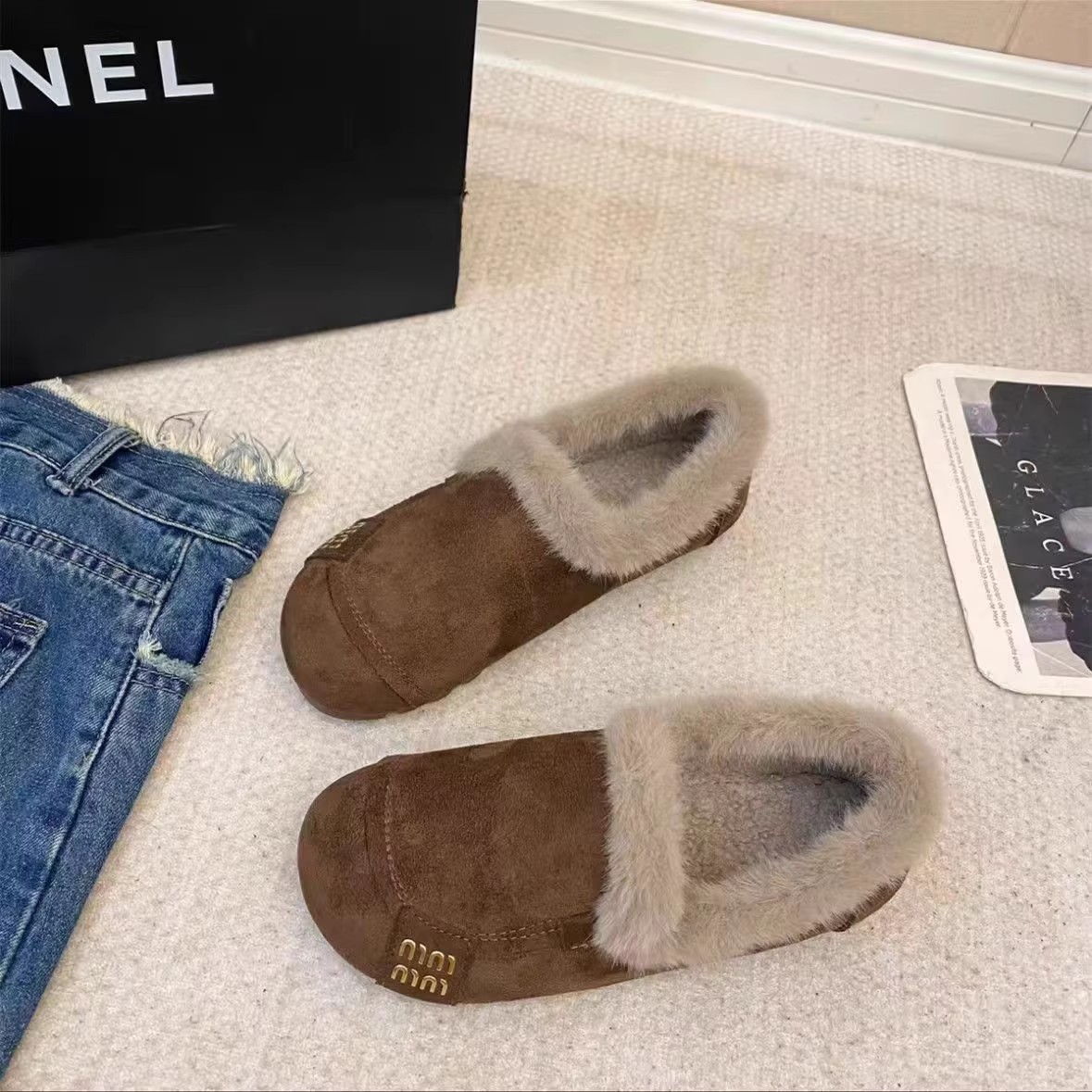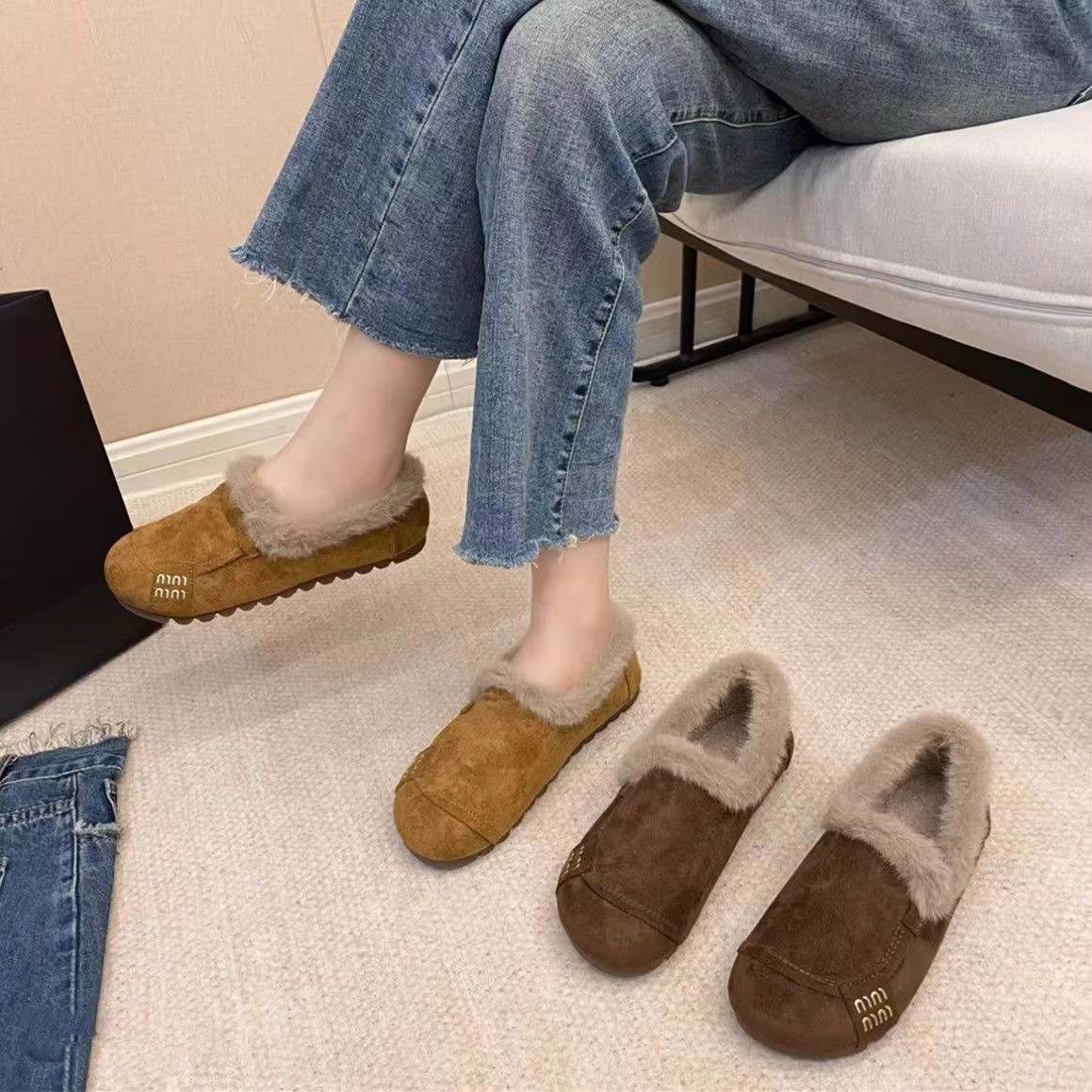 2025冬季新款复古平底浅口加绒保暖豆豆鞋一脚蹬软底防滑勃肯棉鞋