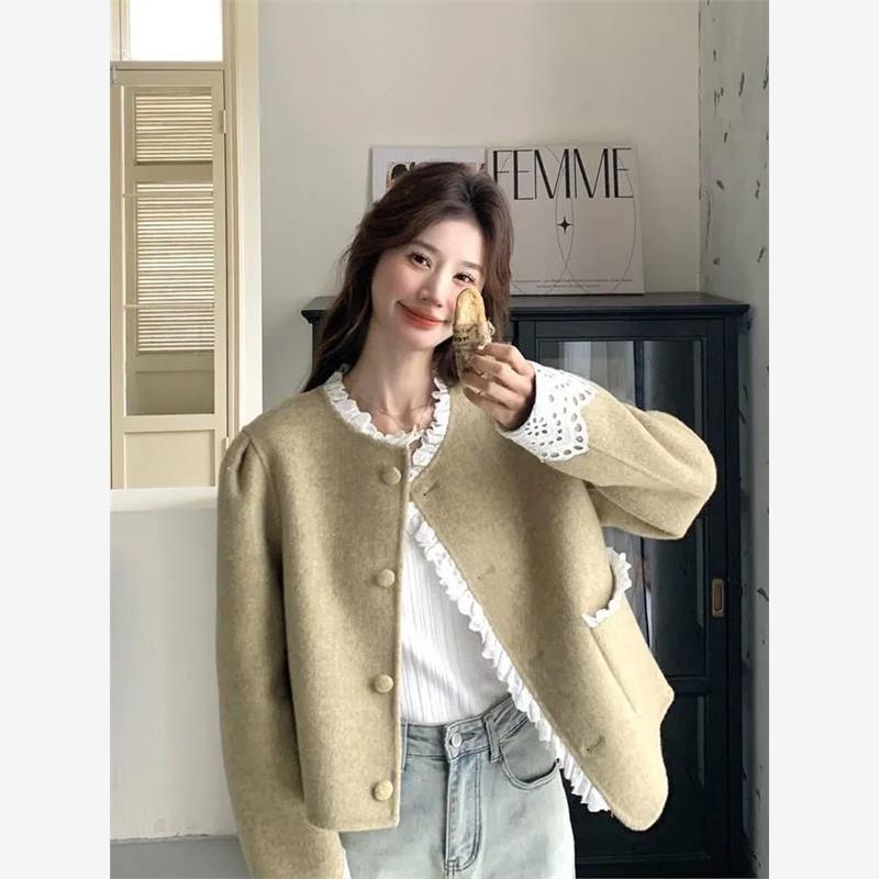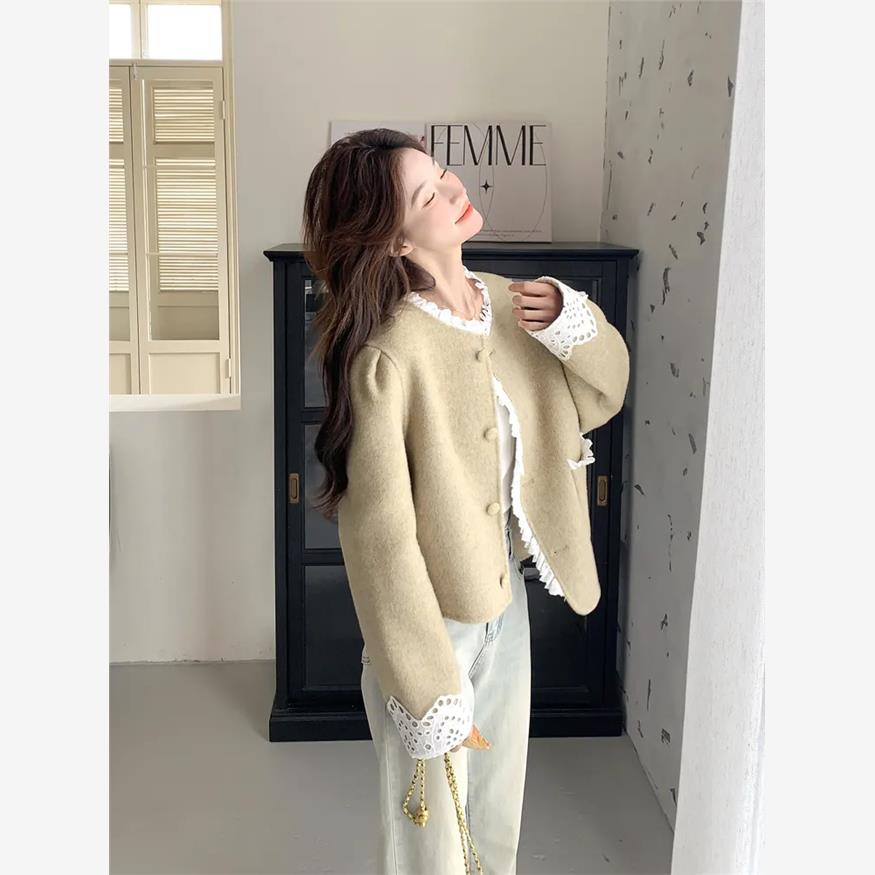 蕾丝拼接小香风毛呢外套女春季超好看小个子韩版宽松短款呢子上衣