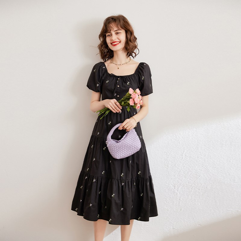 白鹿语法式撞色绣花连衣裙2025年夏季款方领泡泡短袖浪漫长款裙子
