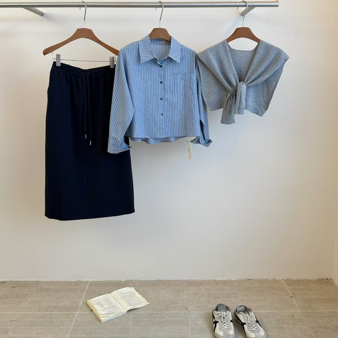 victory2韩版时尚套装女秋季新款条纹衬衫+披肩+半身裙小众三件套