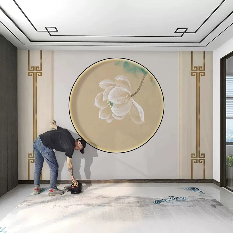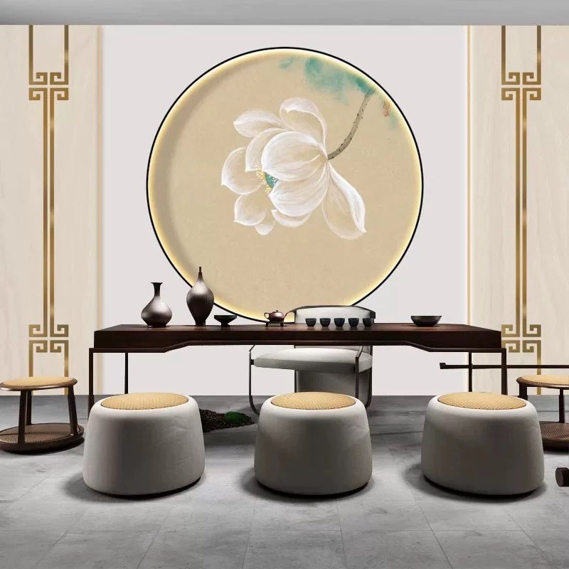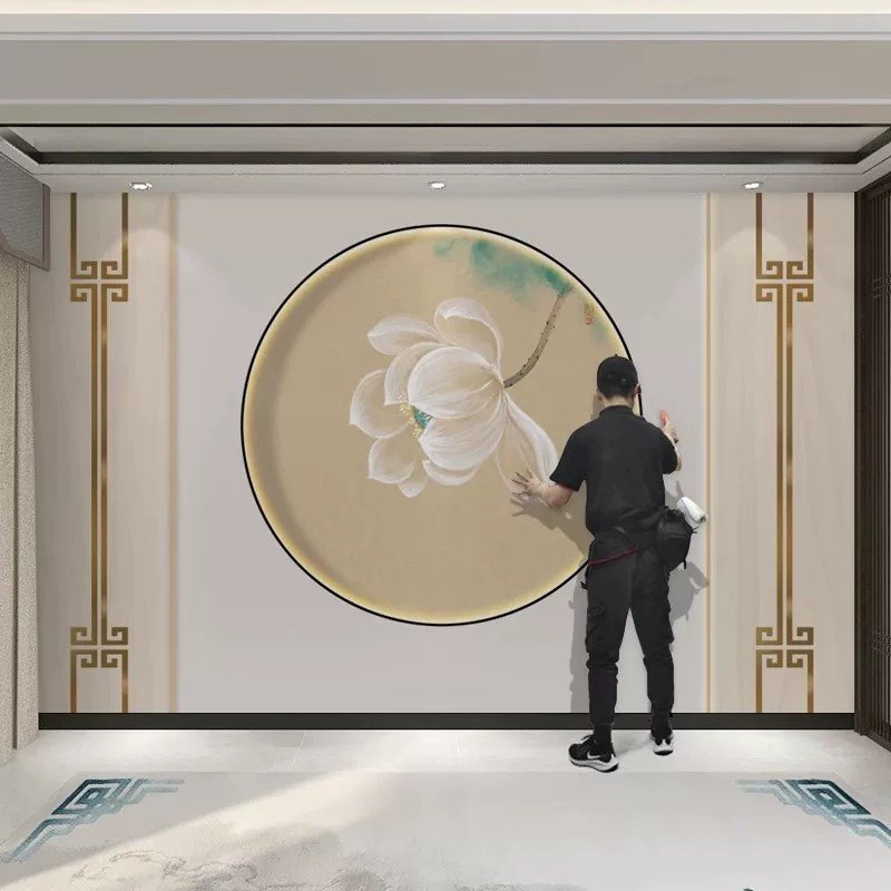 新中式客厅沙发电视背景墙壁纸荷花3d壁布新中式书房墙布8D无缝墙