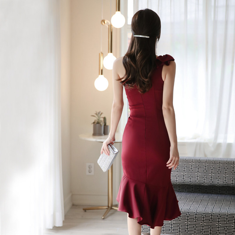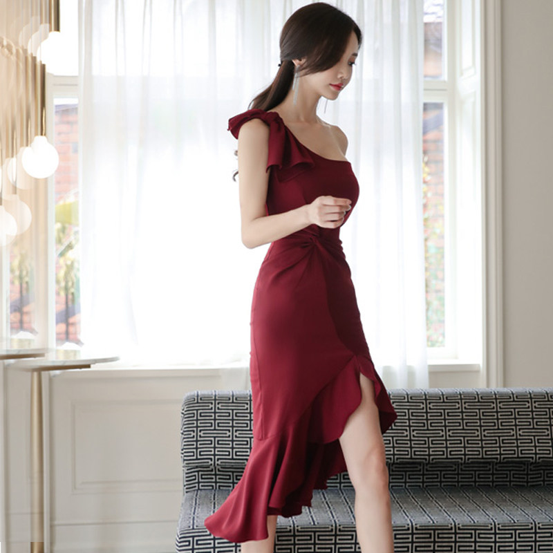 时尚盛会一字肩连衣裙红色新款荷叶边初恋裙显瘦修身红色礼服裙子