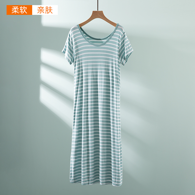 莫代尔条纹居家睡裙女夏季薄款圆领短袖长裙大码宽松可外穿连衣裙