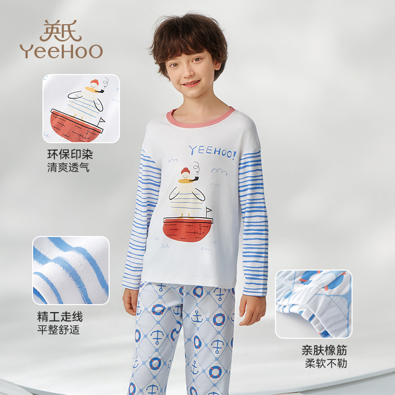 英氏儿童睡衣套装男童春秋长袖长裤中大童家居服a类秋衣男孩打底