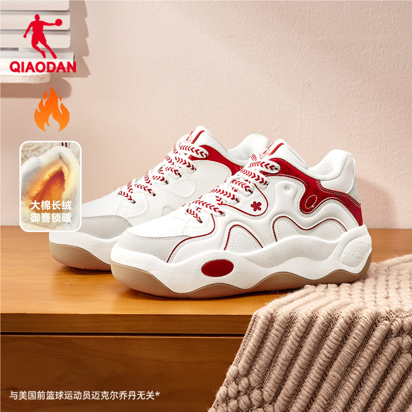 乔丹红色加绒保暖棉鞋皮面防水女款2025冬季新款运动板鞋厚底增高