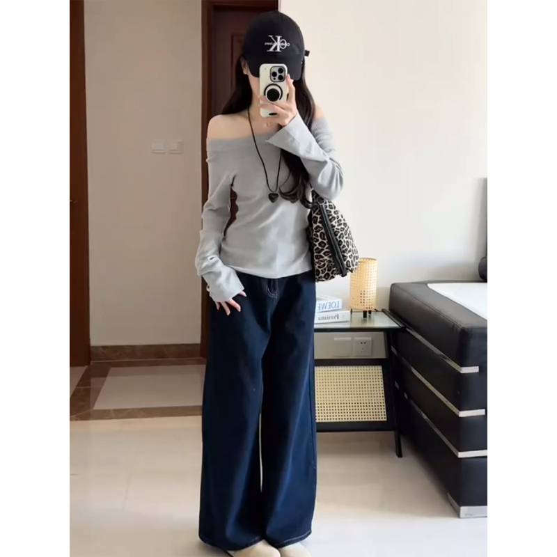 韩系灰色斜领露肩打底衫女2025新款早秋修身显瘦内搭毛衣针织上衣