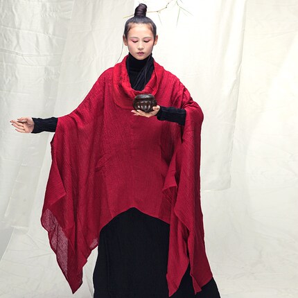 花椿诗意 佛系中国风禅意女装秋季棉麻斗篷式宽松文艺亚麻连衣裙