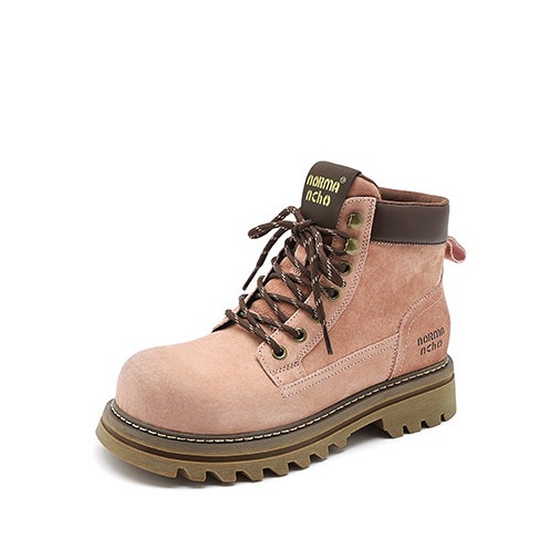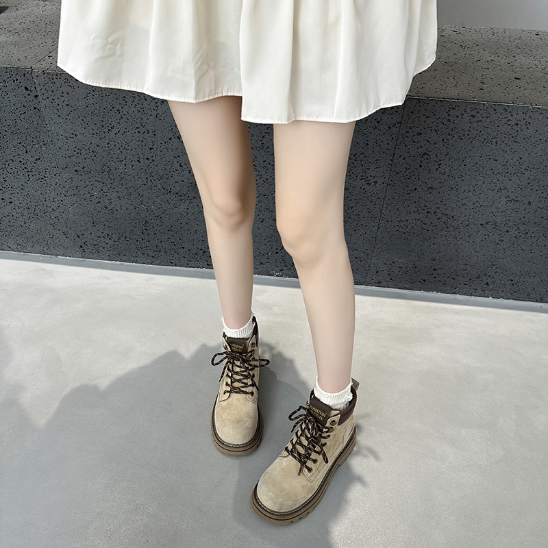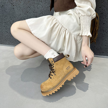 全牛皮大黄靴女复古擦色英伦马丁靴女2024秋冬女圆头系带工装短靴