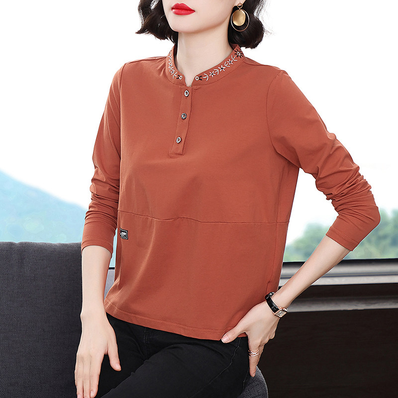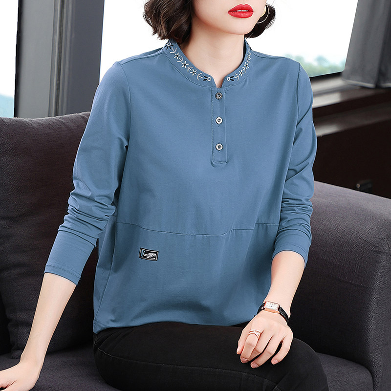妈妈春秋装新款立领洋气上衣打底衫纯棉长袖t恤女中老年衬衫外穿