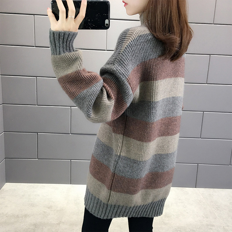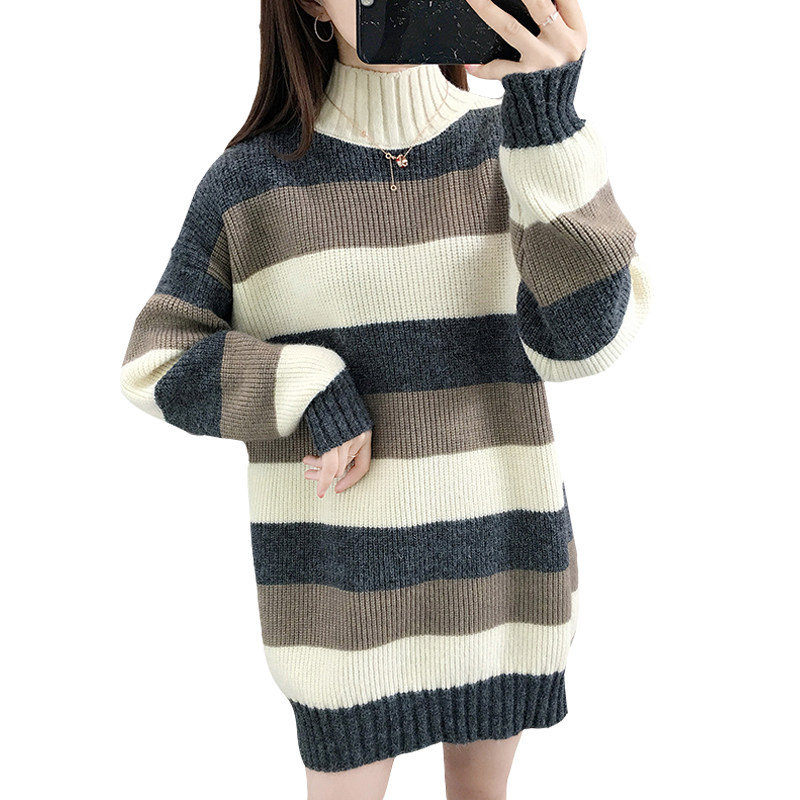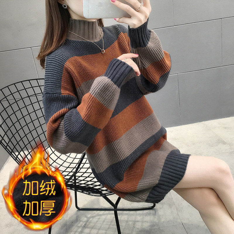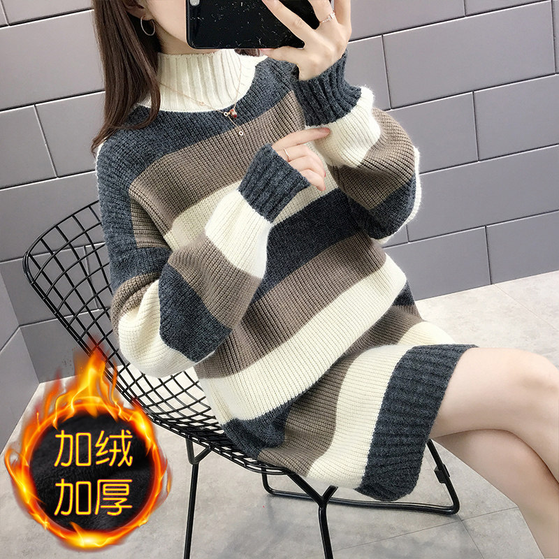中长款条纹毛衣女秋冬宽松2025年新款加绒加厚半高领遮屁股毛衣裙