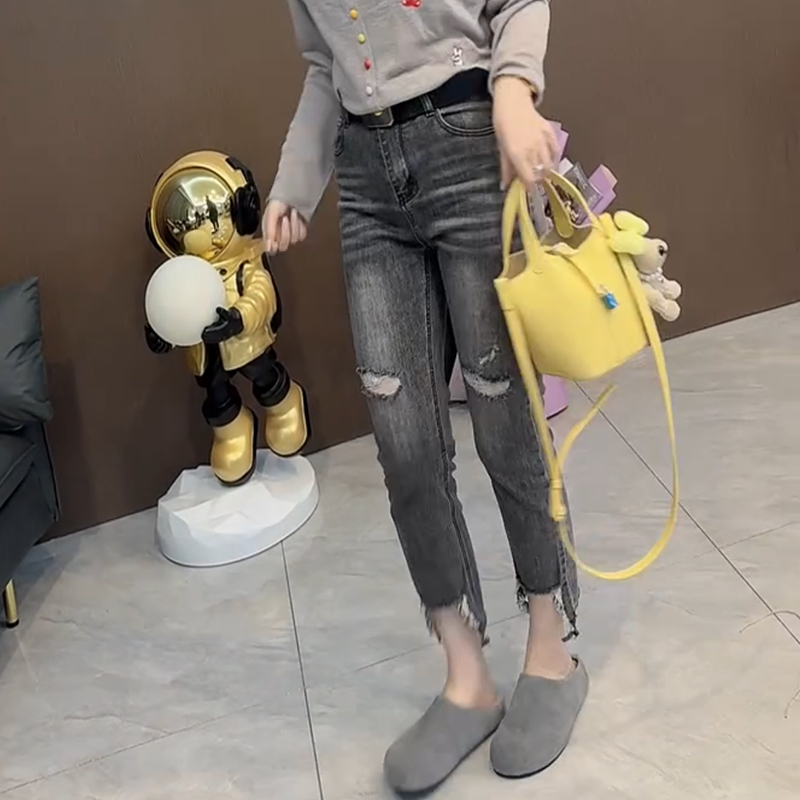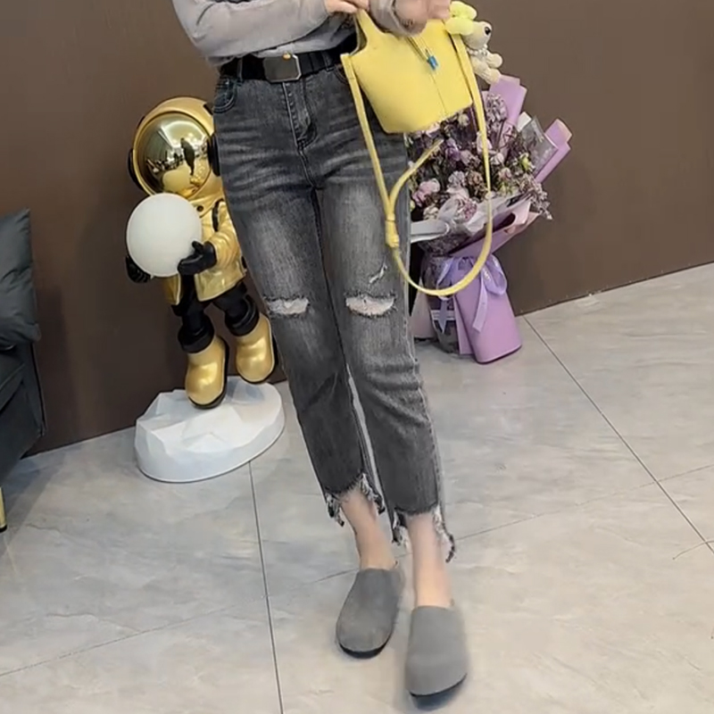 大码女装2025夏季薄款高腰破洞灰色牛仔裤胖mm显瘦时尚直筒烟管裤