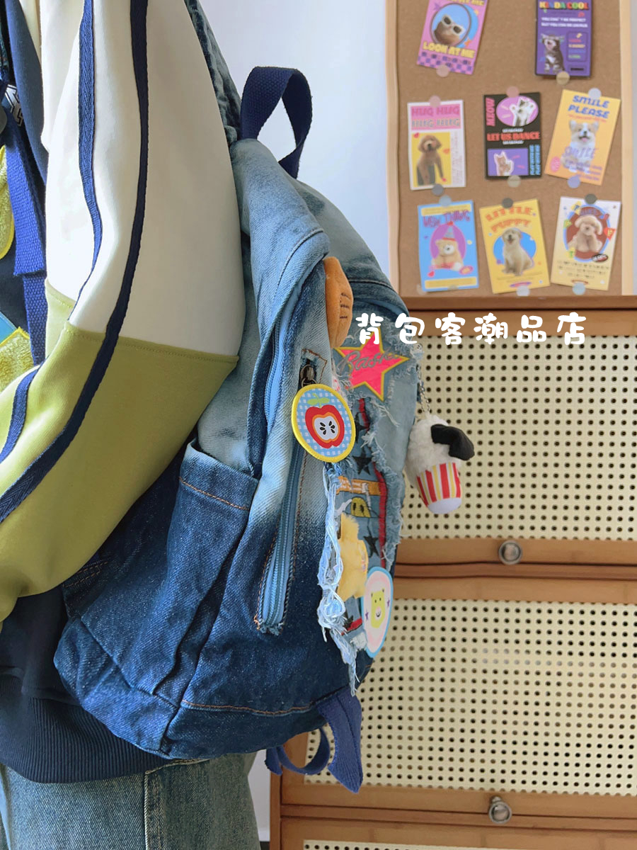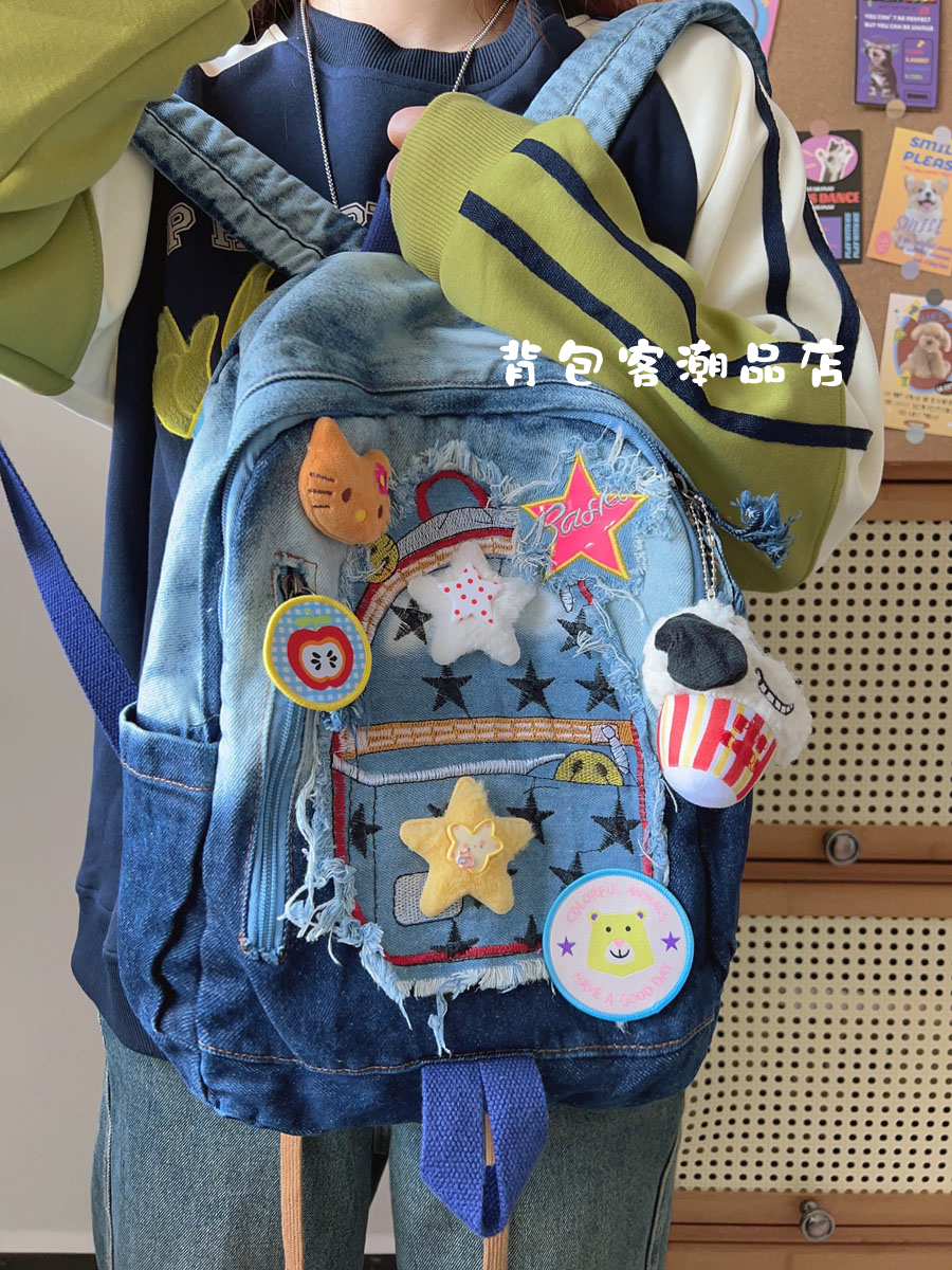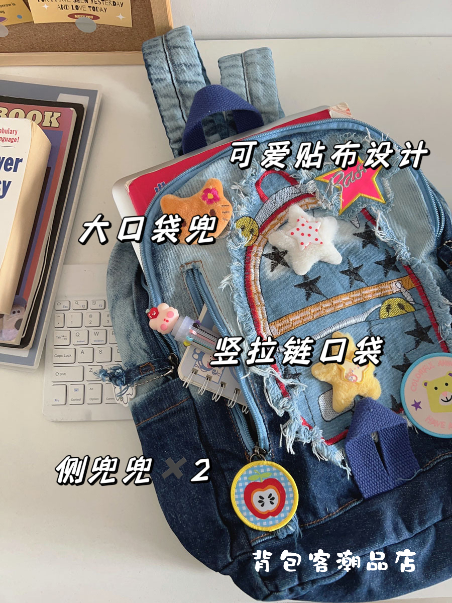 韩国星星贴布牛仔小众卡通校园渐变百搭书包双肩包可爱大学生背包