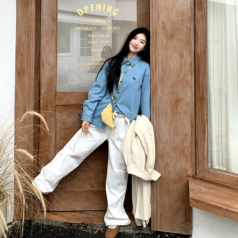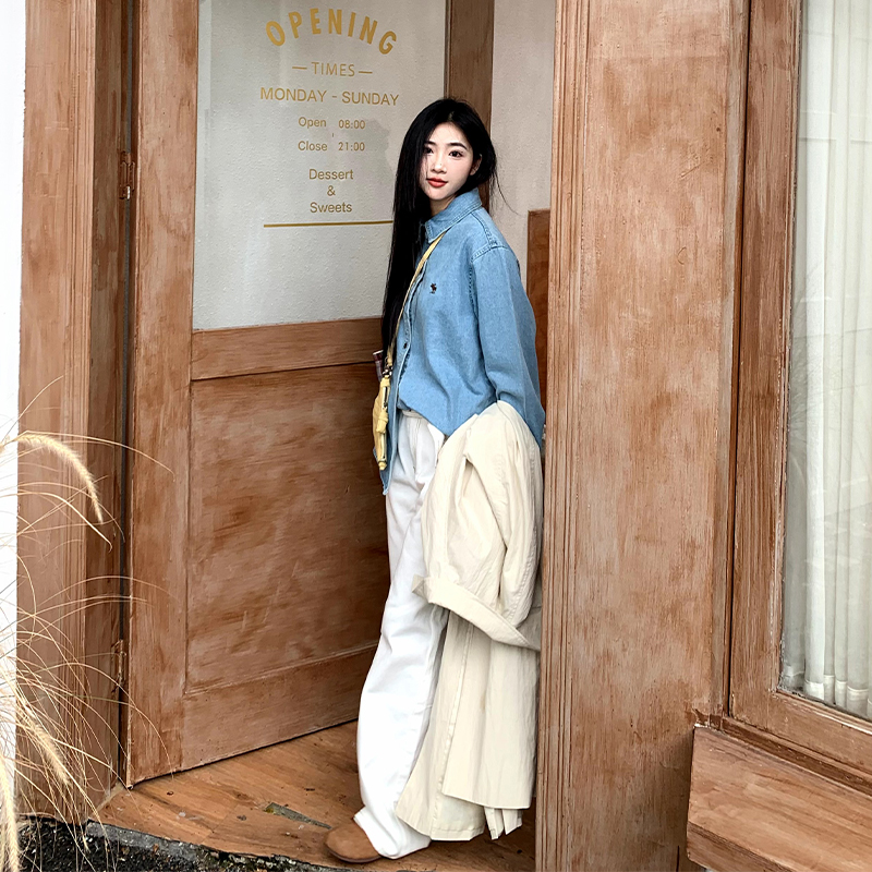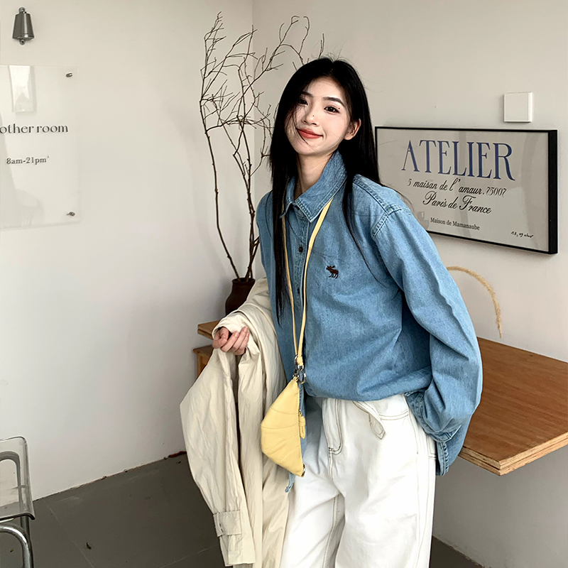 橘子树在哪儿复古水洗蓝色刺绣牛仔衬衫女秋季款宽松百搭长袖衬衣