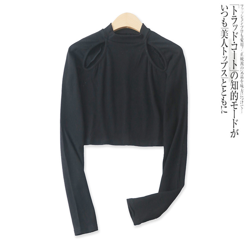 半高领打底衫春季新款外贸女装百搭显瘦镂空短款长袖螺纹T恤16159