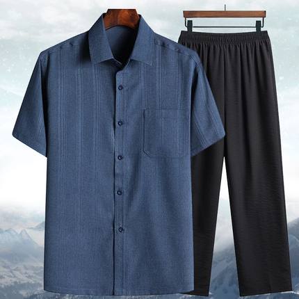 中老年棉麻短袖衬衫男夏季爸爸套装夏H装爷爷衣服老人男士免烫衬