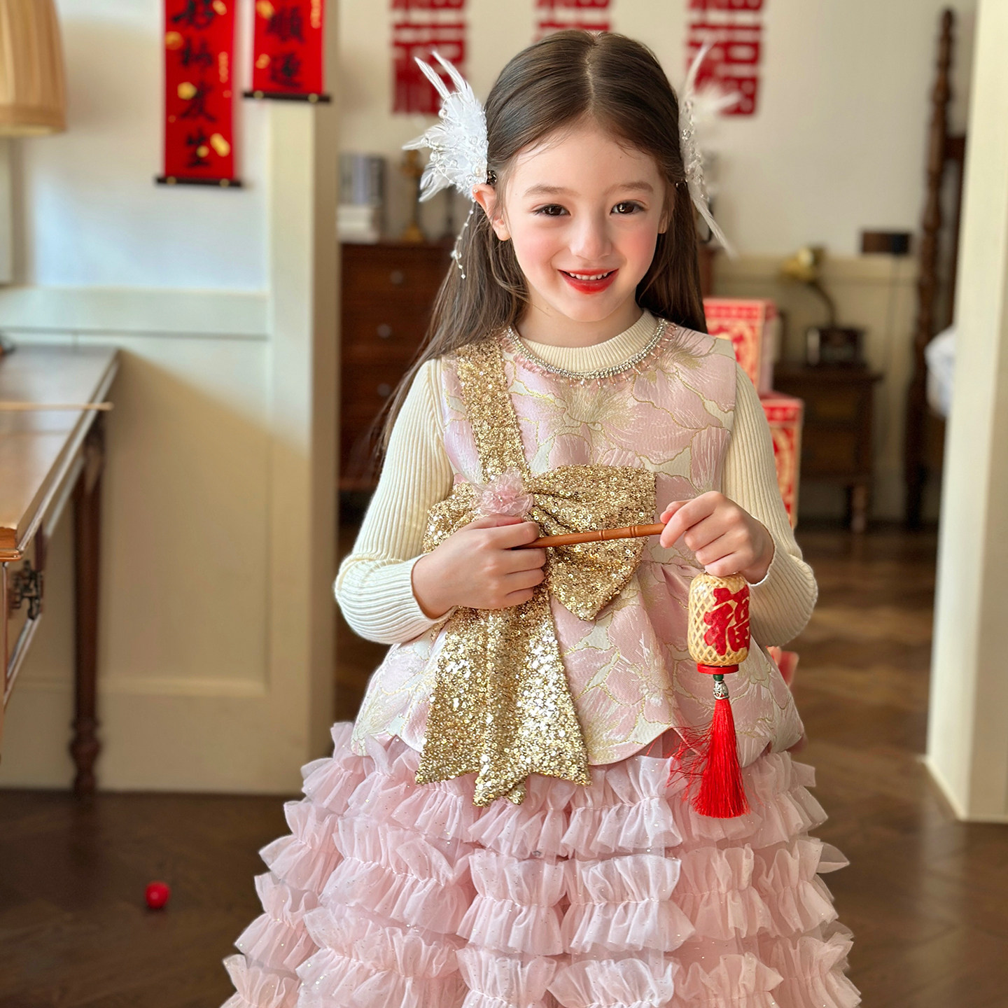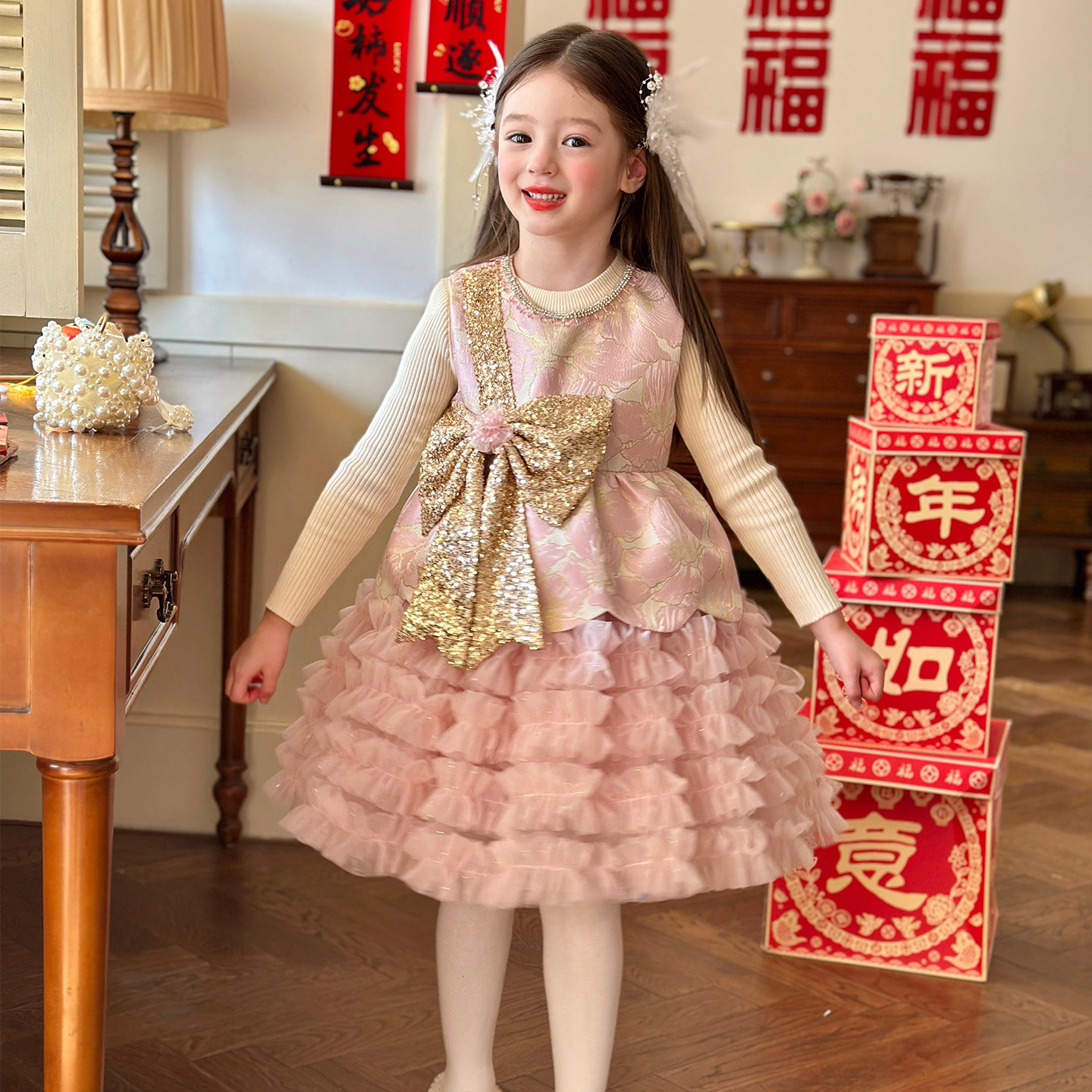 栀了成长记童装女童甜美背心公主裙2025冬季儿童蝴蝶结加绒连衣裙