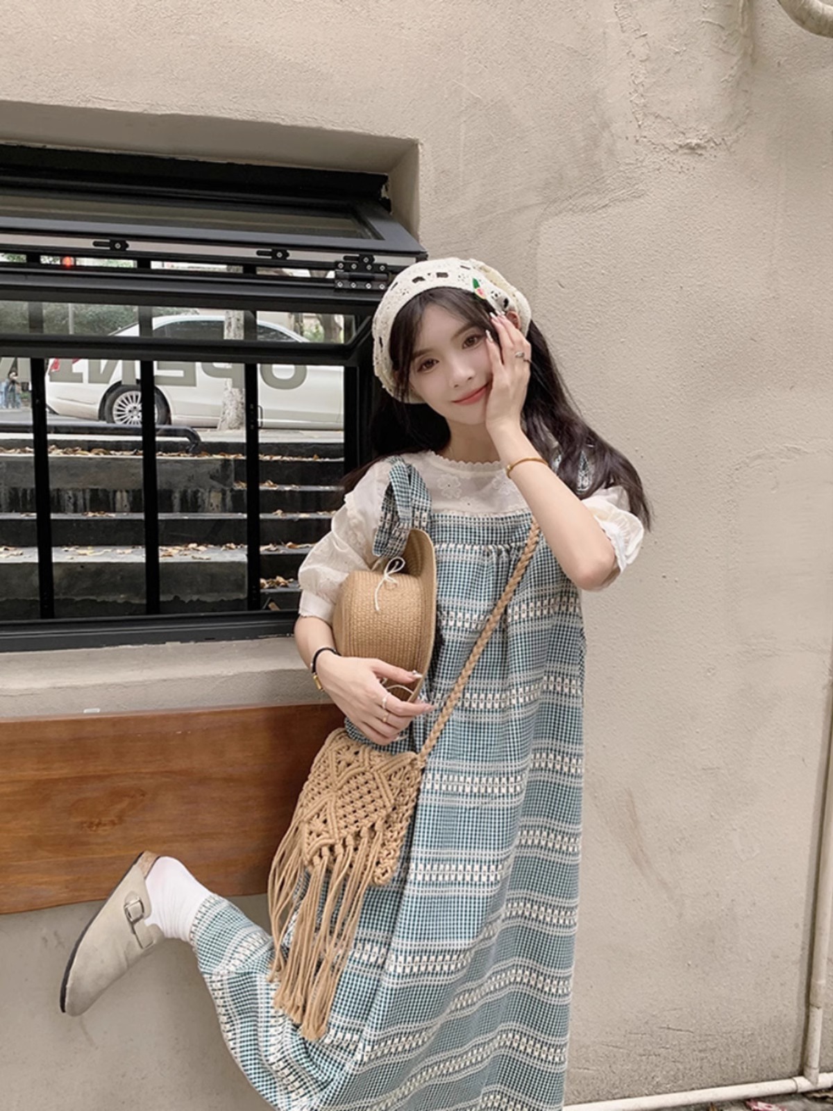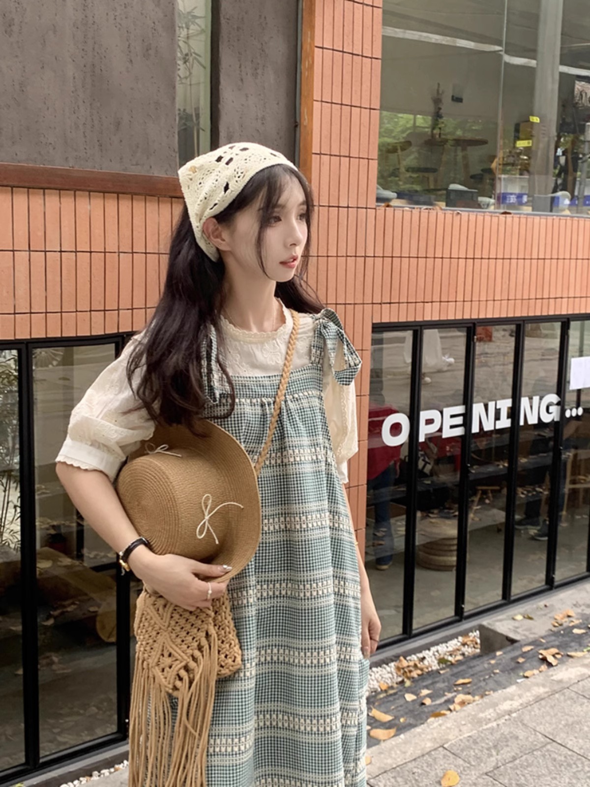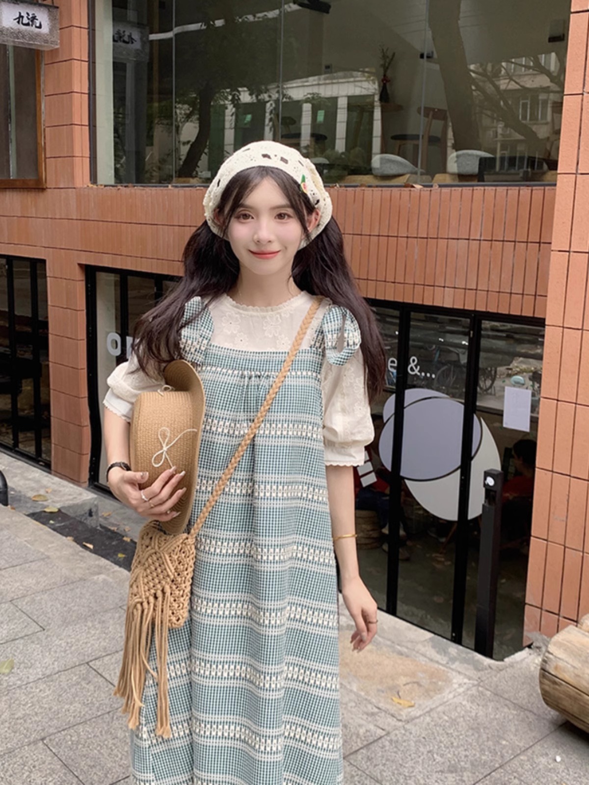 甜美风套装女夏季蕾丝花边泡泡袖衬衫减龄格子背带裙连衣裙两件套