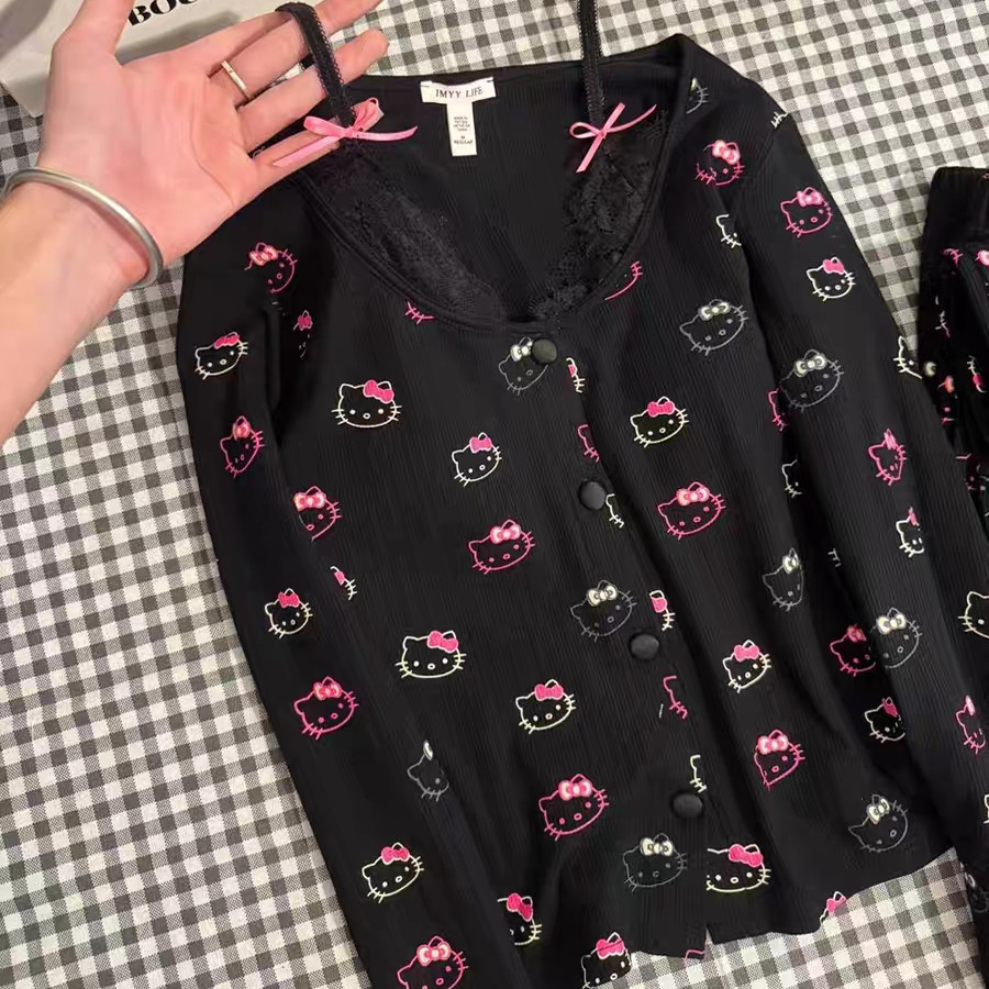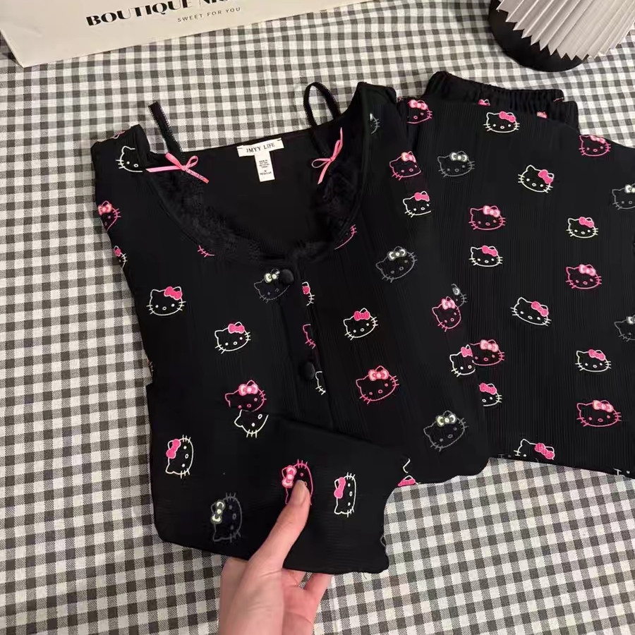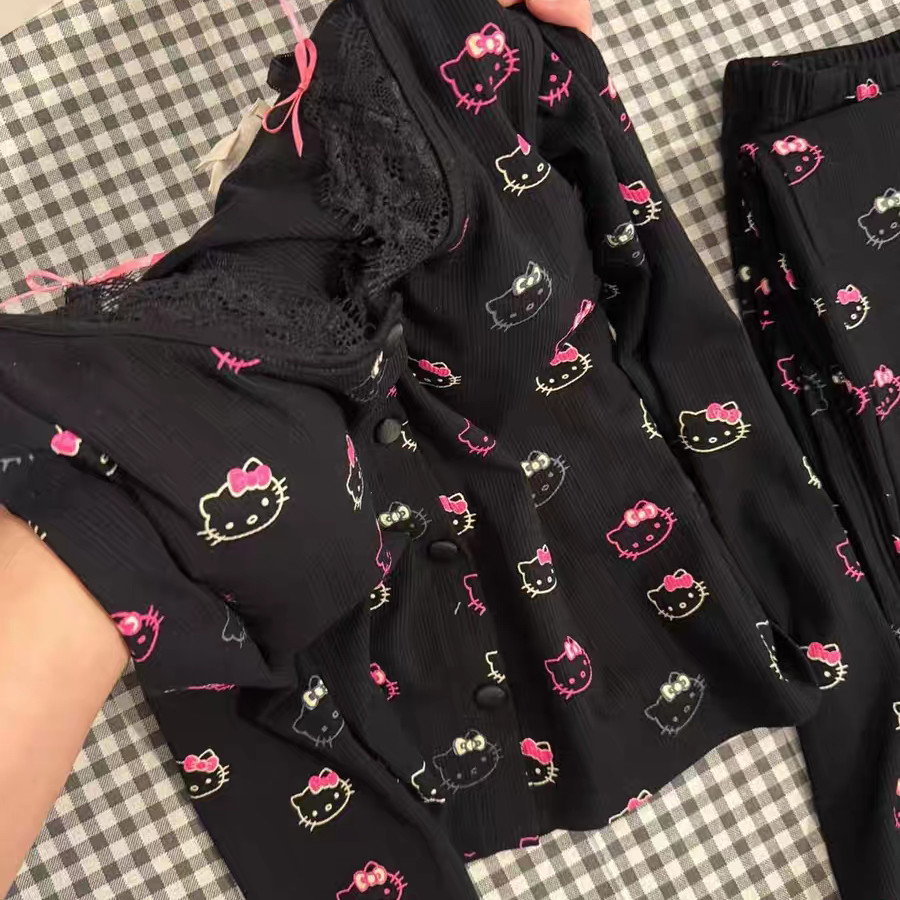 2025新款春夏春秋睡衣女带胸垫长袖可爱kitty可外穿家居服套装