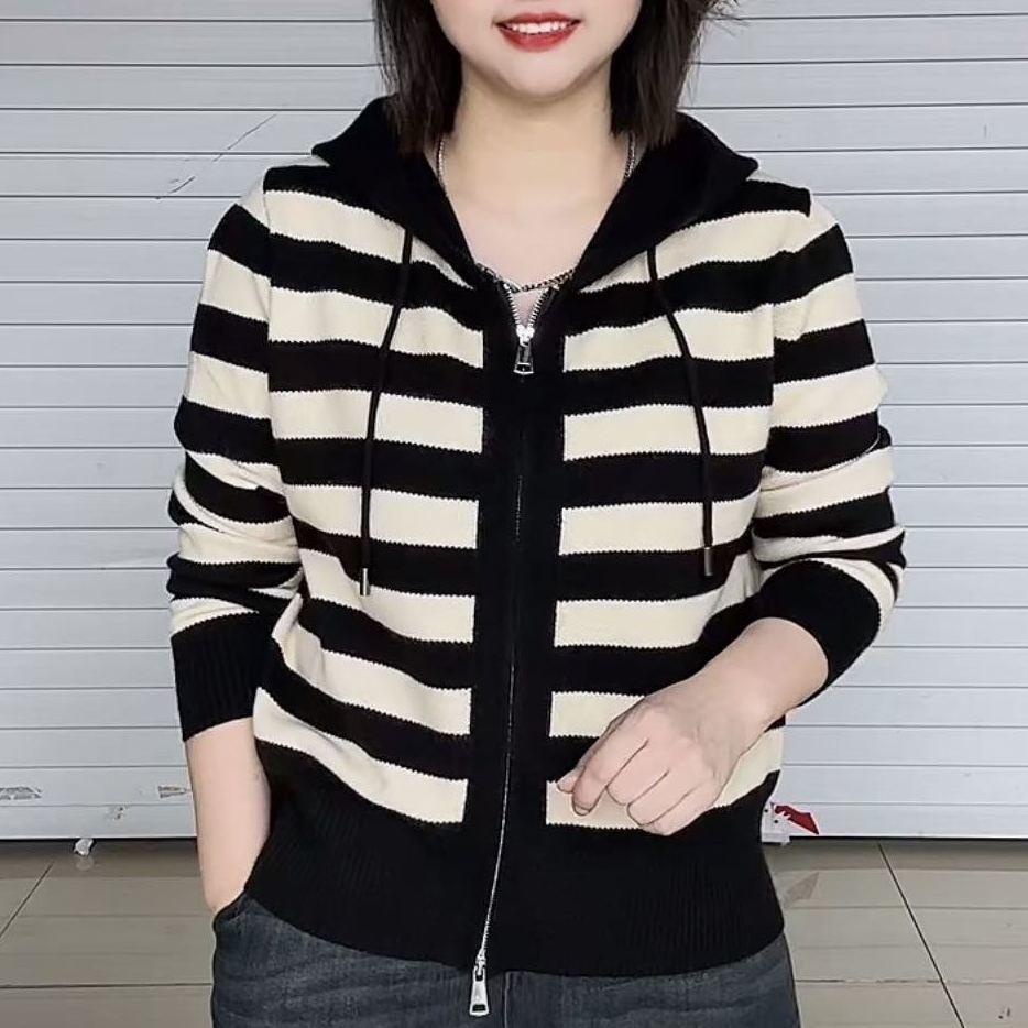 洋派长袖针织衫女2025秋季新款连帽宽松百搭条纹休闲毛衣外套上衣