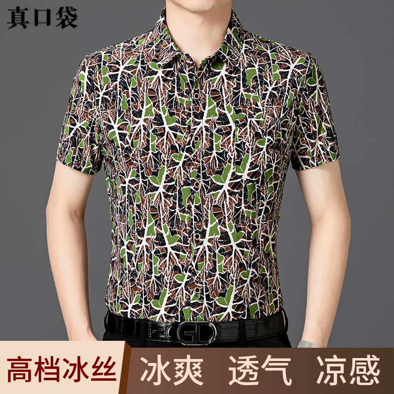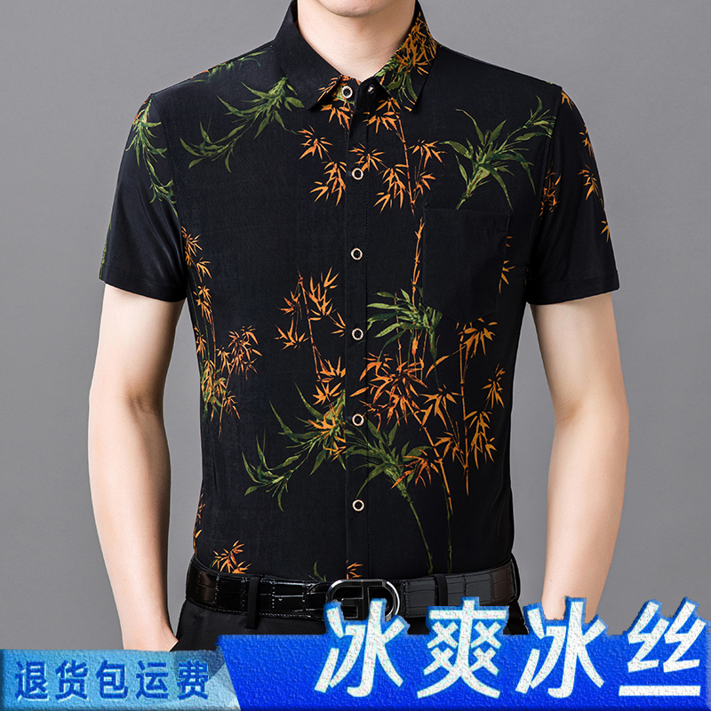 夏装中年男士短袖花衬衫弹力商务印花休闲宽松大码碎花衬衣爸爸装