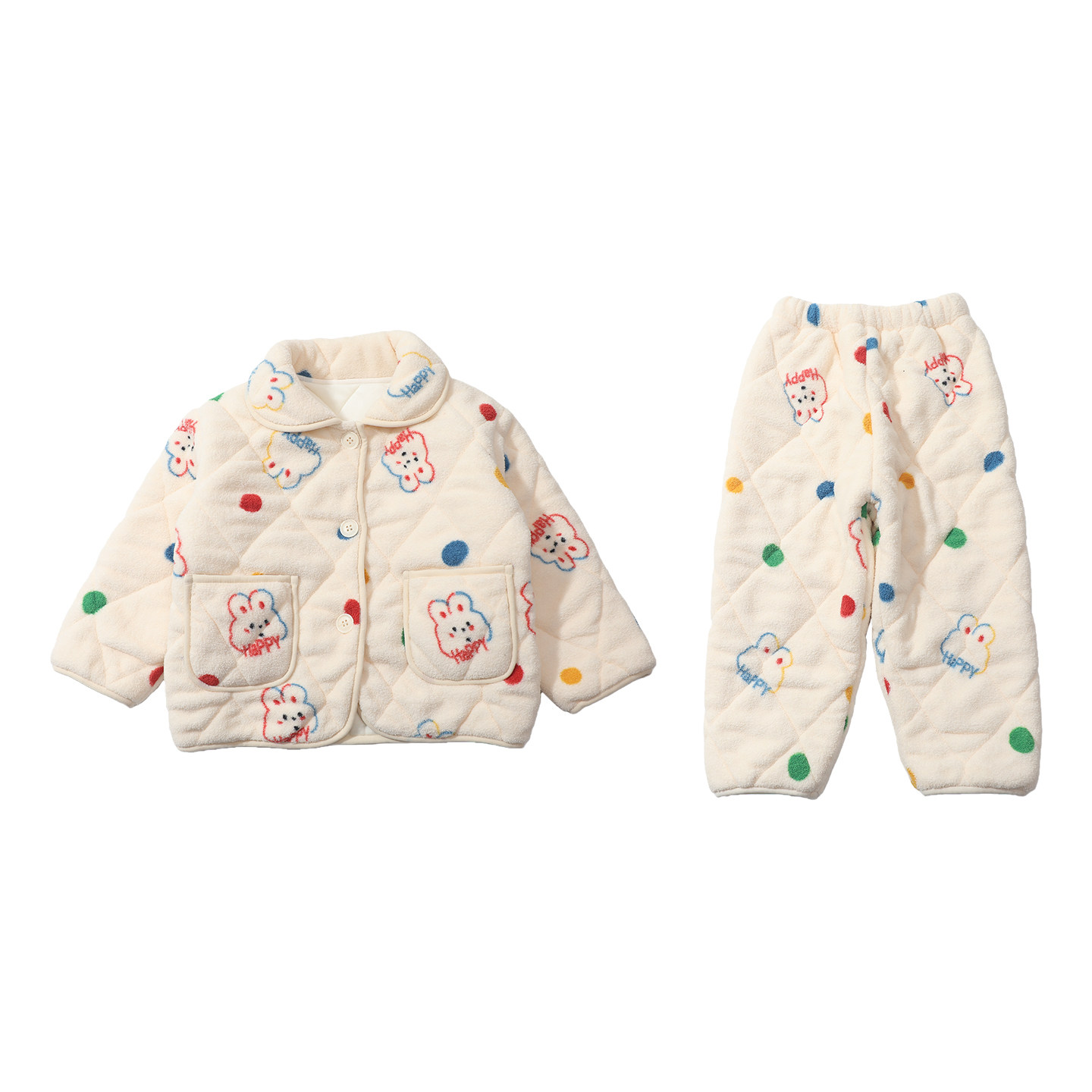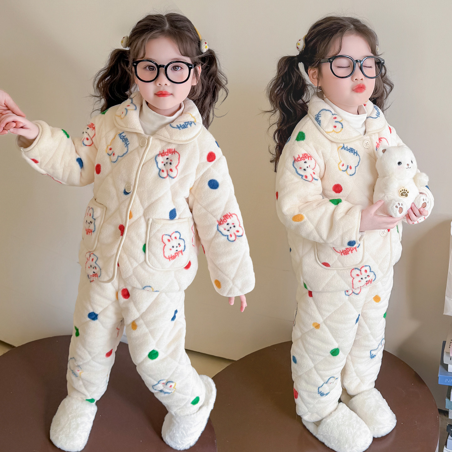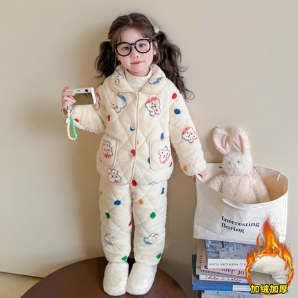 女童睡衣三层加厚2025新款法兰绒秋冬保暖翻领女宝宝珊瑚绒家居服