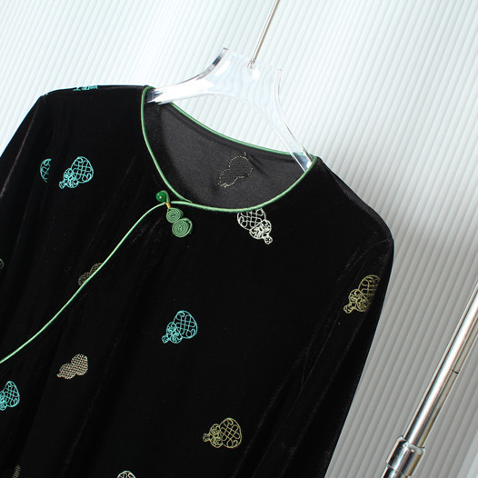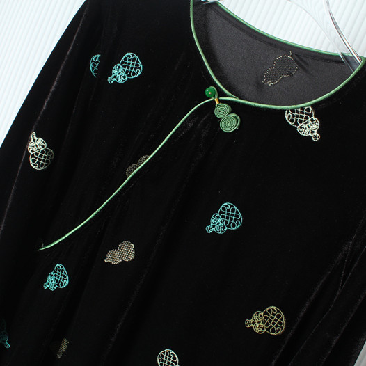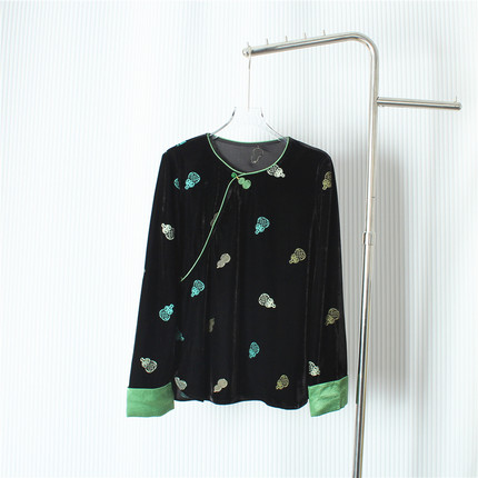 秋冬新中式国风丝绒衬衫圆领斜襟葫芦刺绣拼接撞色翻袖打底上衣女