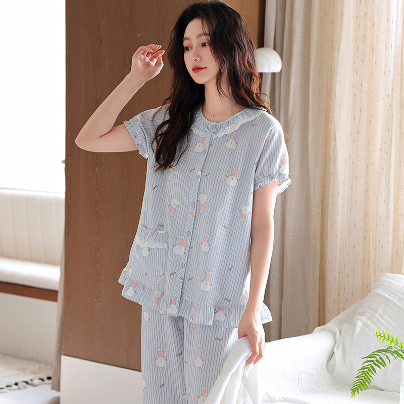 新一步薄款2025新款夏季短袖睡衣女纯棉七分裤花边开衫印花家居服