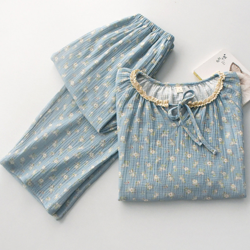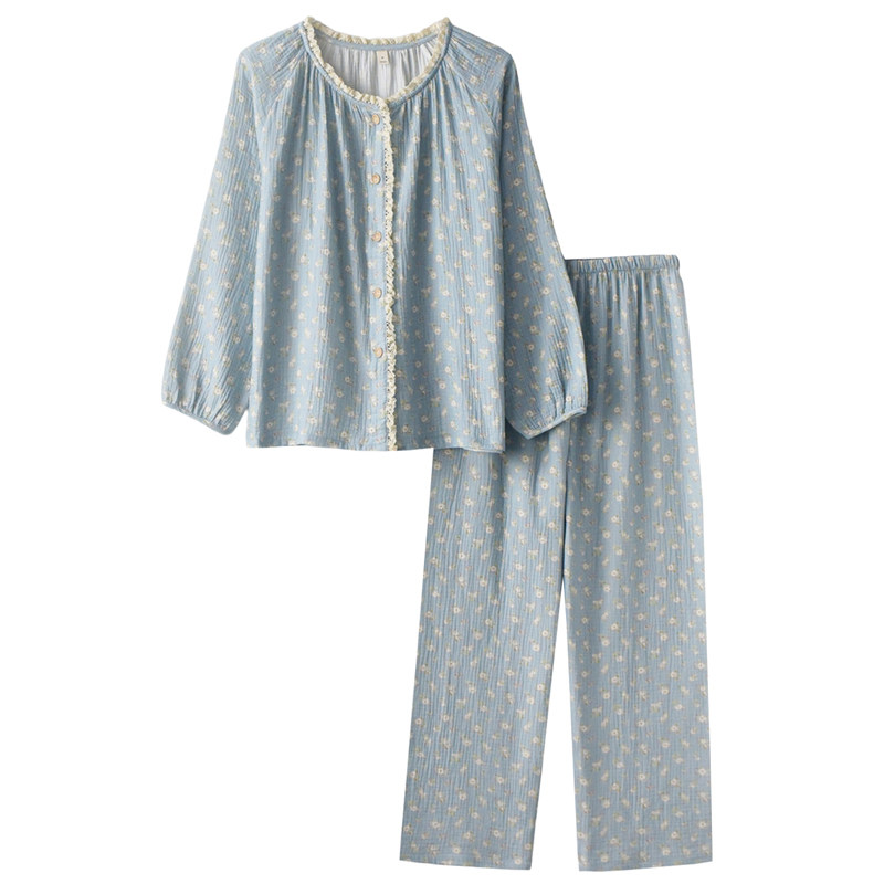 甜美花边蓝色印花睡衣女士春夏季纯棉纱布薄款宽松长袖家居服套装