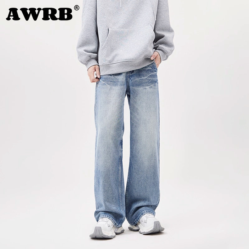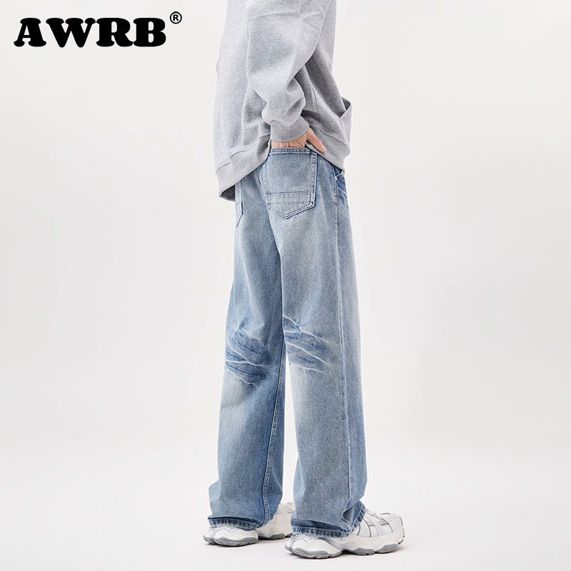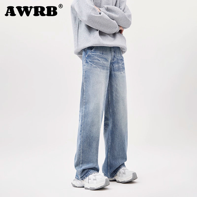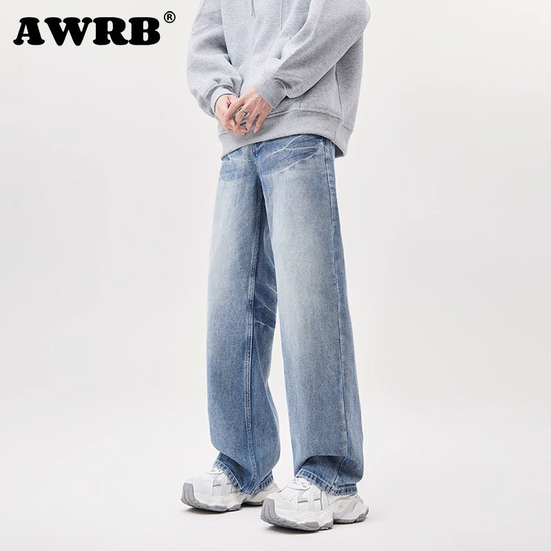 AWRB美式复古水洗闪电纹做旧牛仔裤男宽松直筒阔腿拖地长裤子