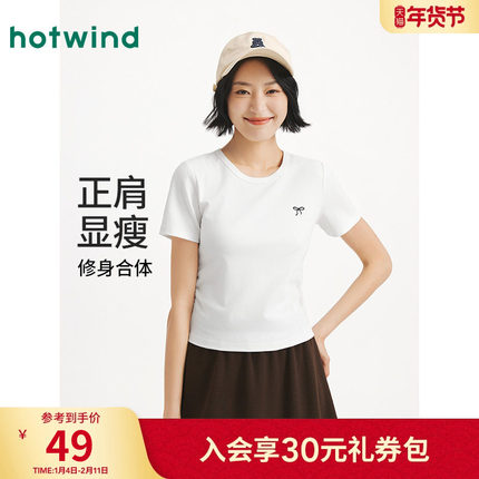 热风女士短袖T恤上衣2025年秋季新款修身蝴蝶结短T恤白色打底衫