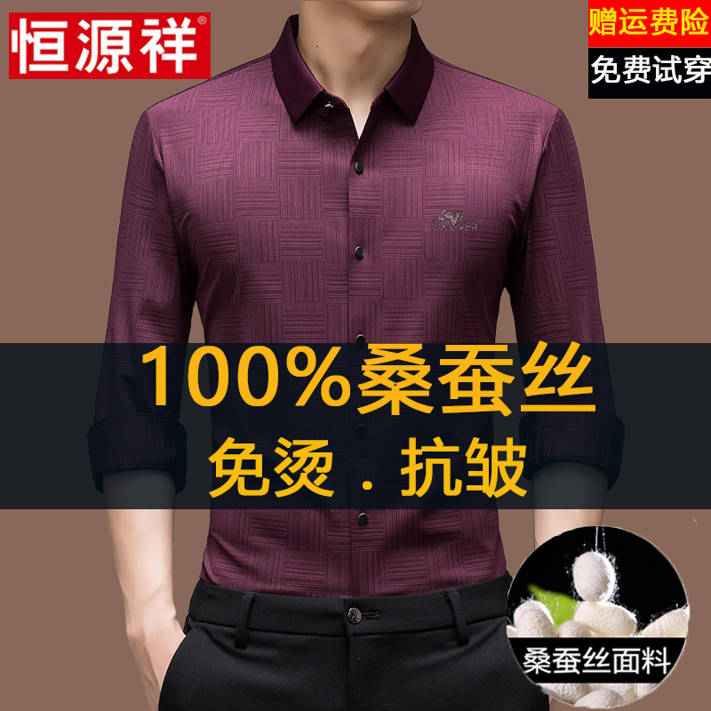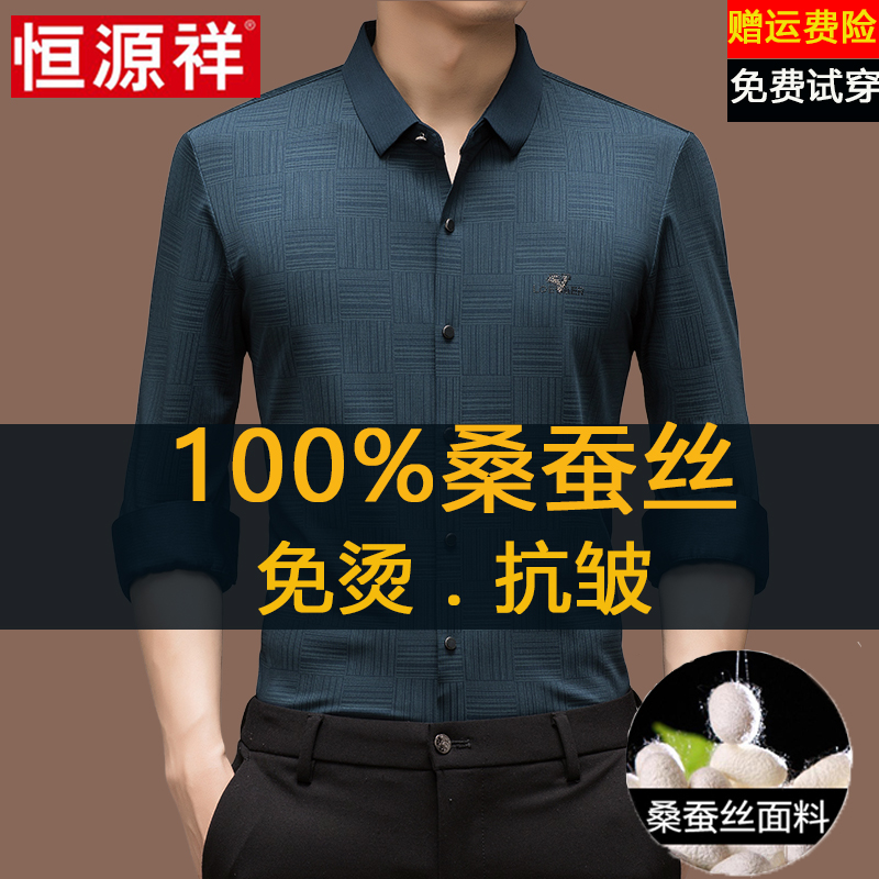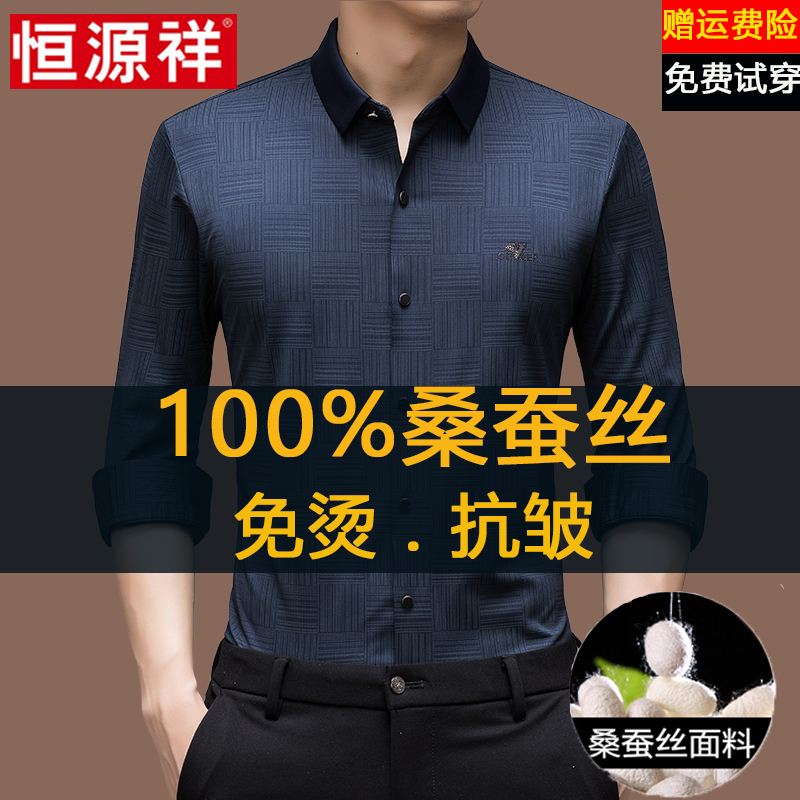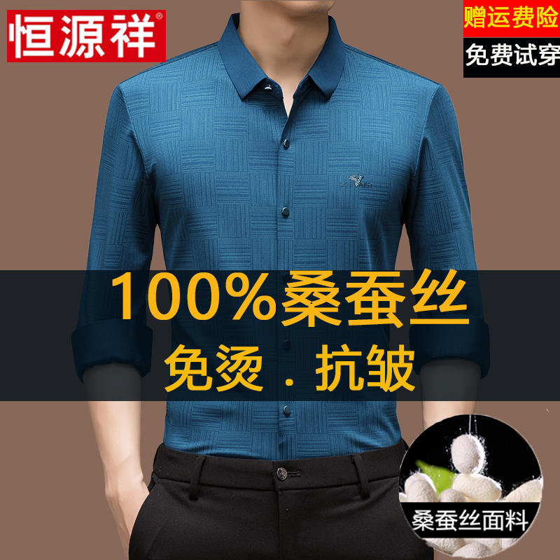 恒源祥100%桑蚕丝无痕衬衫男长袖垂感春秋季商务休闲中年免烫衬衣