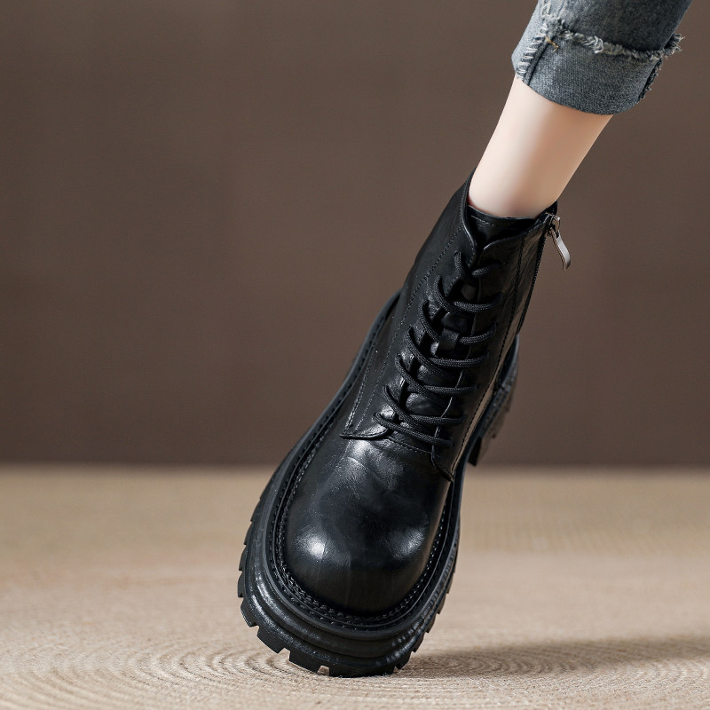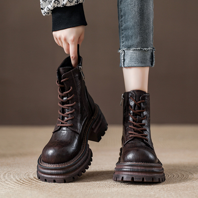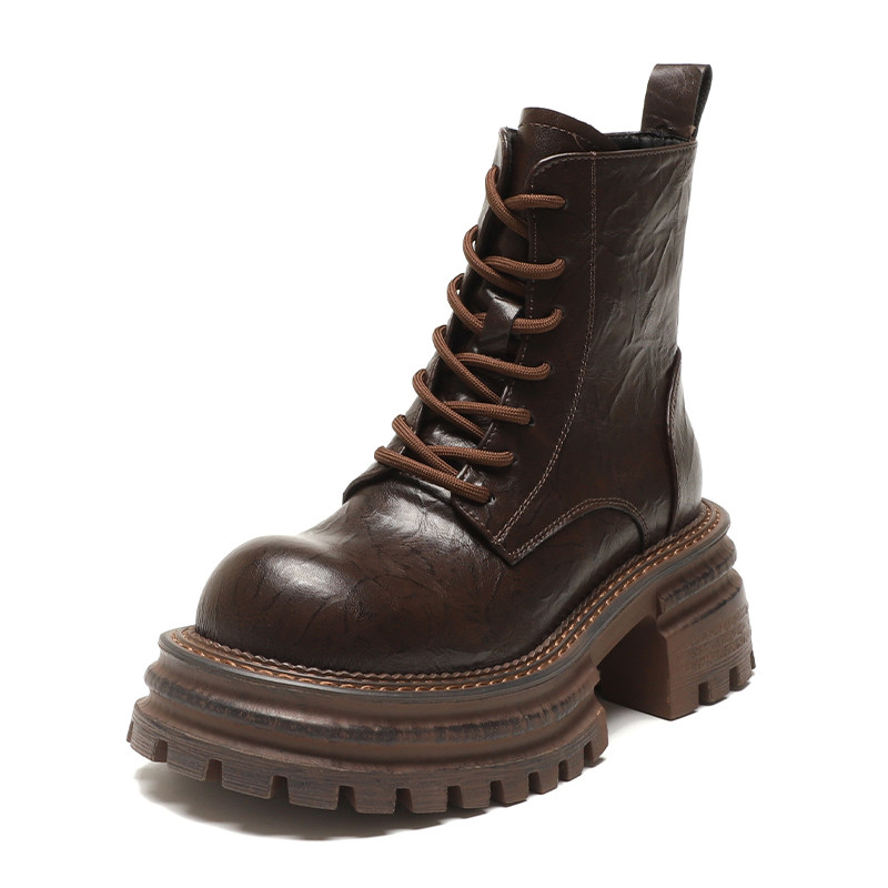 松糕厚底褶皱棕色高级感马丁靴女2024年秋季新款女士显瘦短靴子女