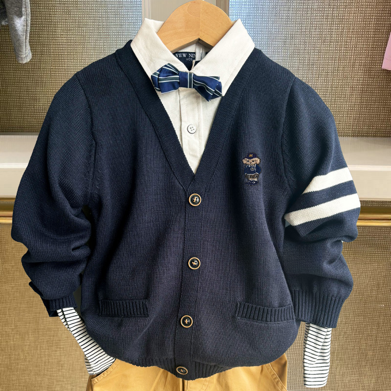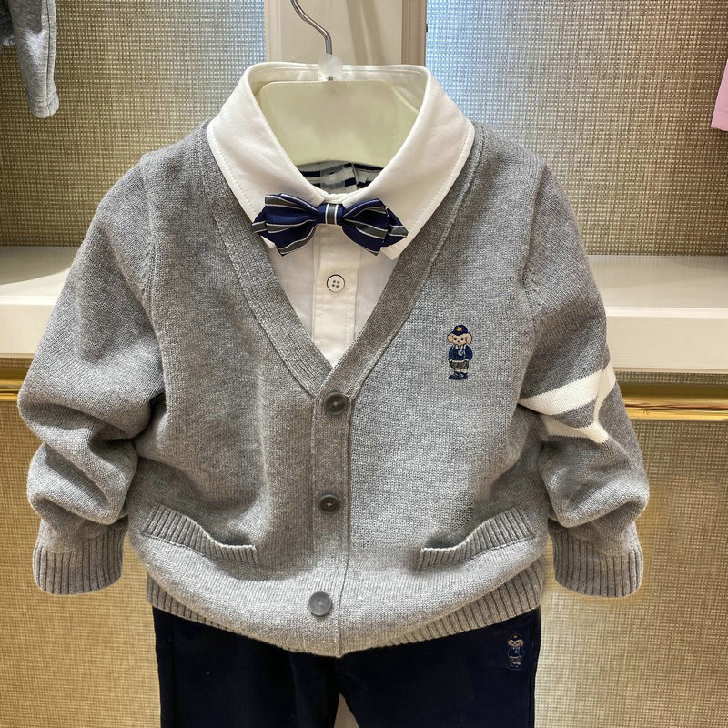 清秋冬春款围尼小熊男童领结衬衫假两件针织毛衣精梳棉线验货品质