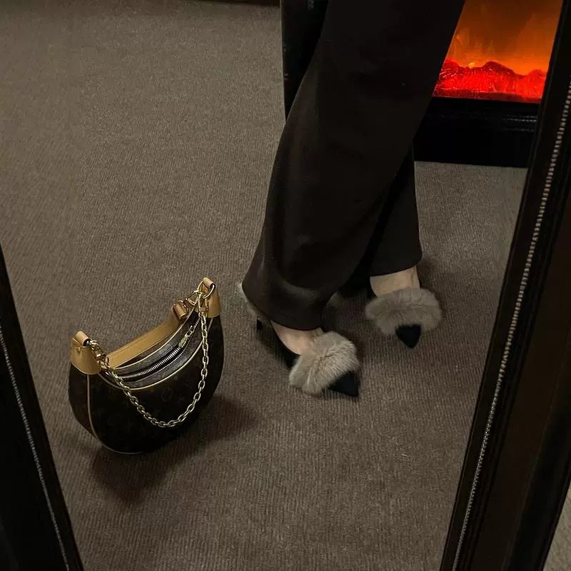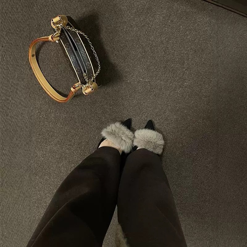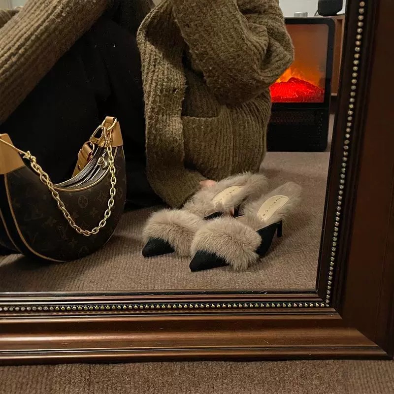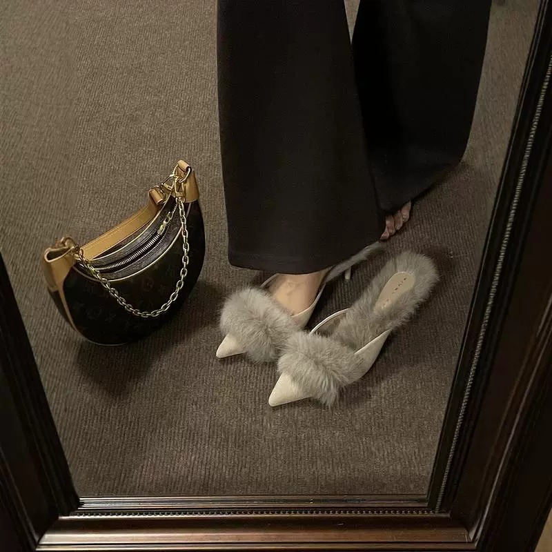 毛毛高跟鞋女冬外穿2024新款包头半拖鞋设计感小众御姐风尖头单鞋