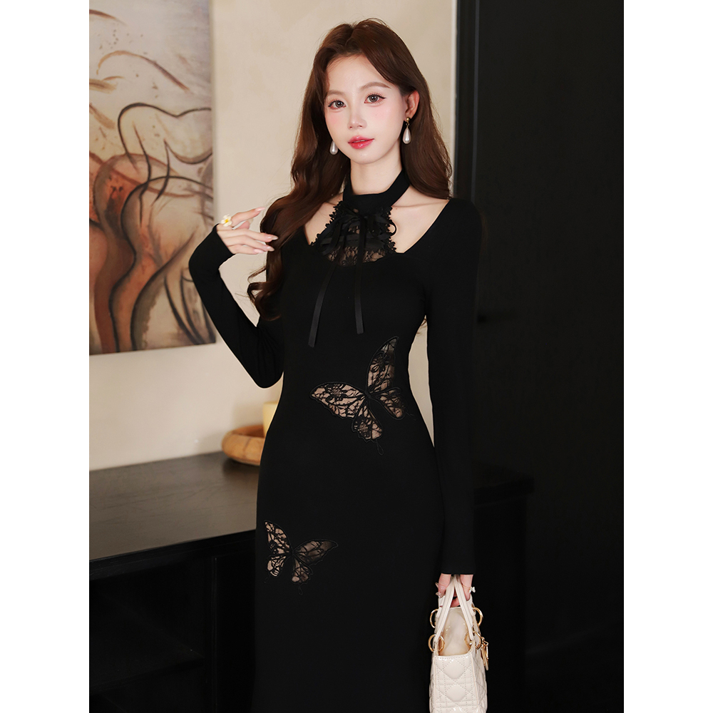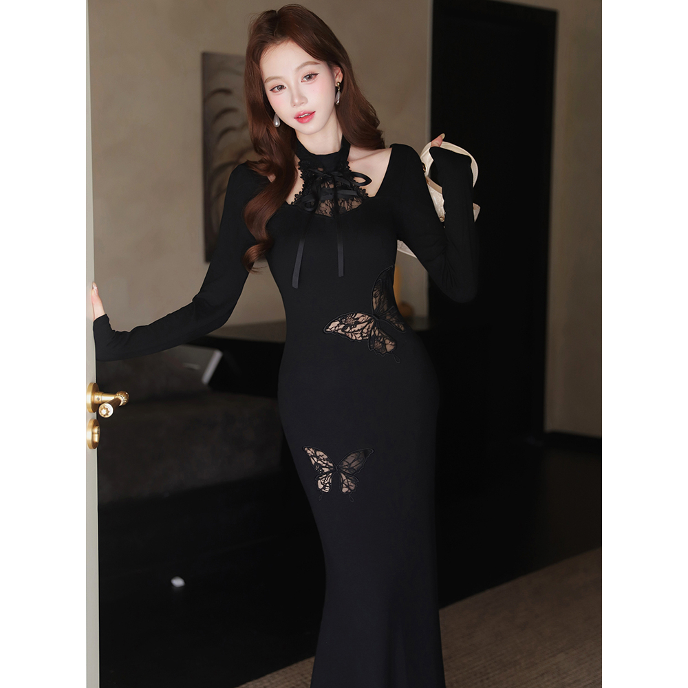 2025新款时尚纯黑色修身鱼尾刺绣蝴蝶长裙秋款百搭打底时尚连衣裙