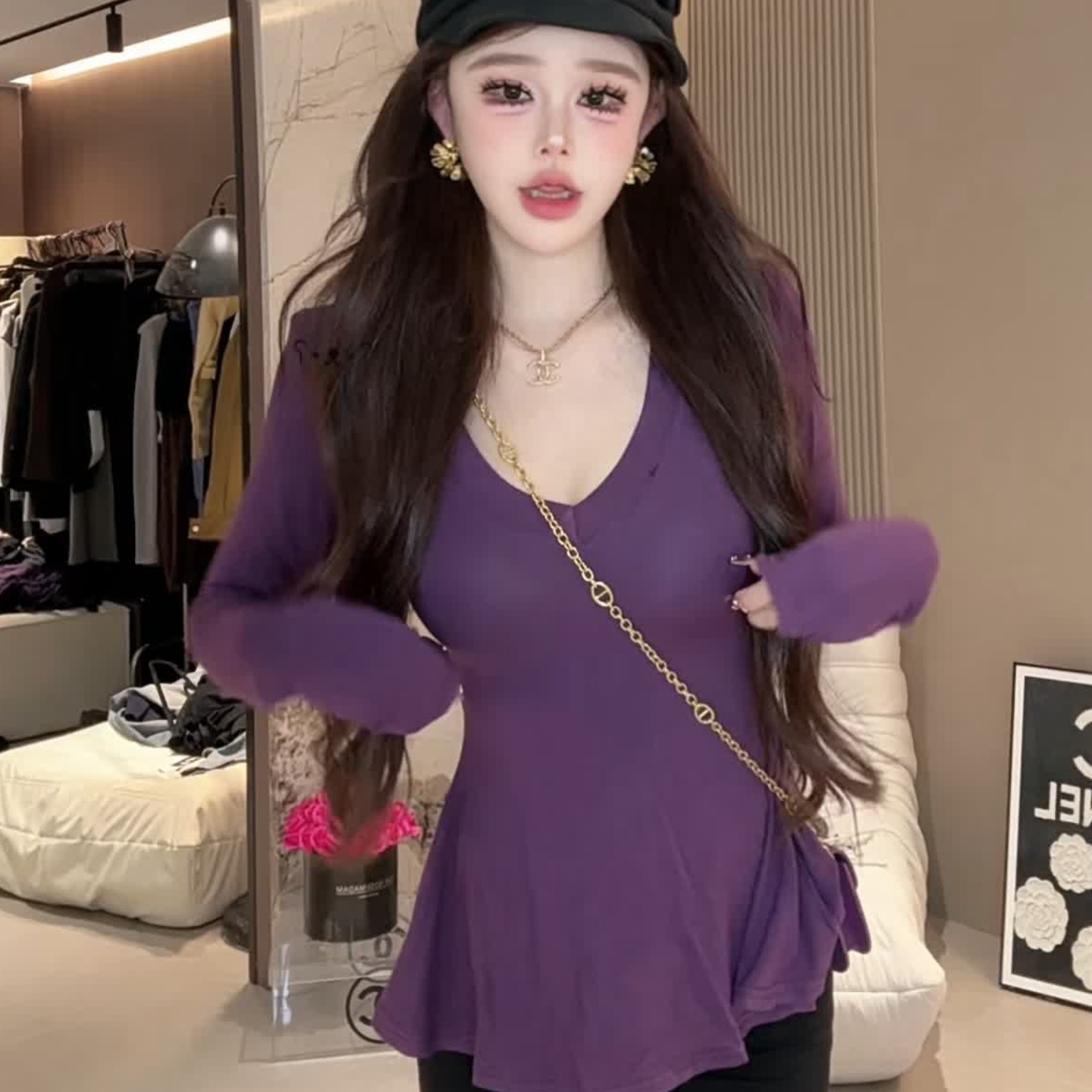 大码胖mm设计感v领长袖T恤打底衫女春秋冬季百搭修身显瘦内搭上衣