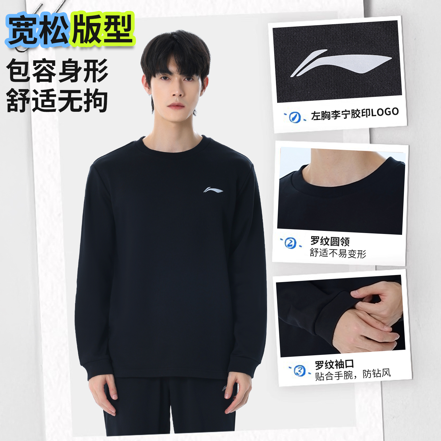 李宁卫衣男士秋季情侣圆领套头衫黑色宽松长袖加绒上衣运动服女款
