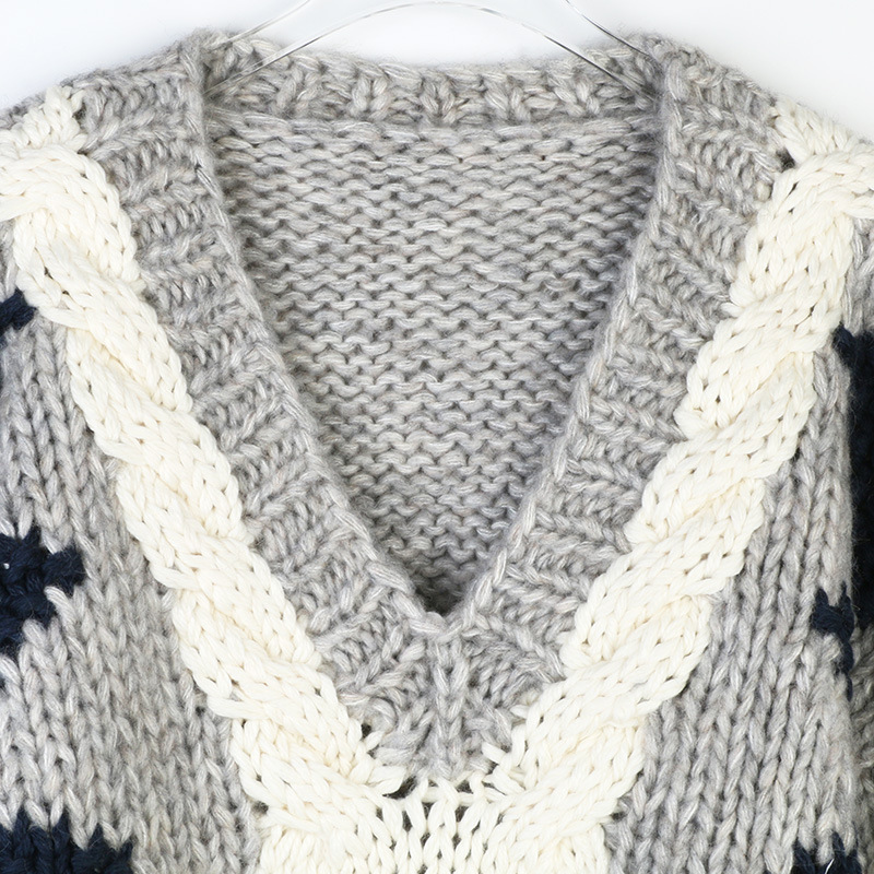 欧美慵懒毛衣上衣女式撞色立体宽松时尚春秋V领长袖毛衣针织衫女