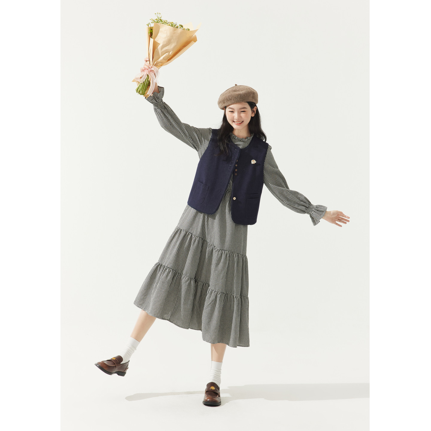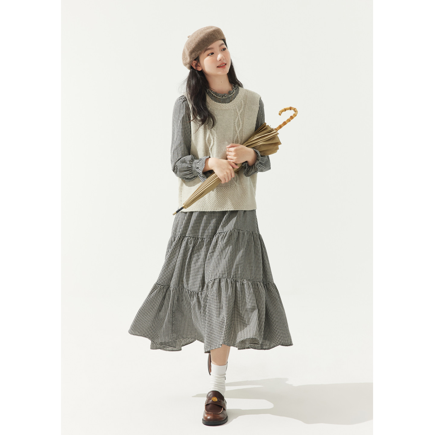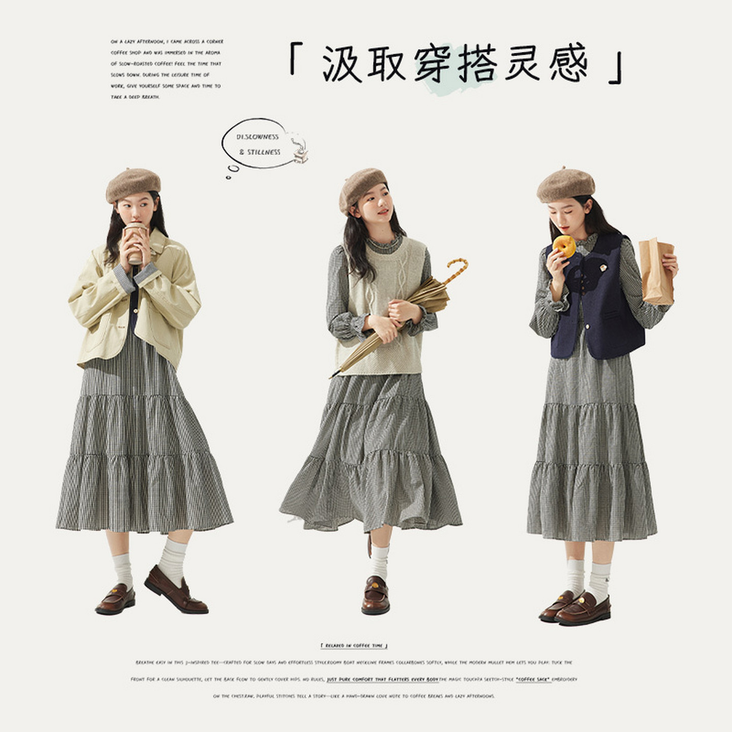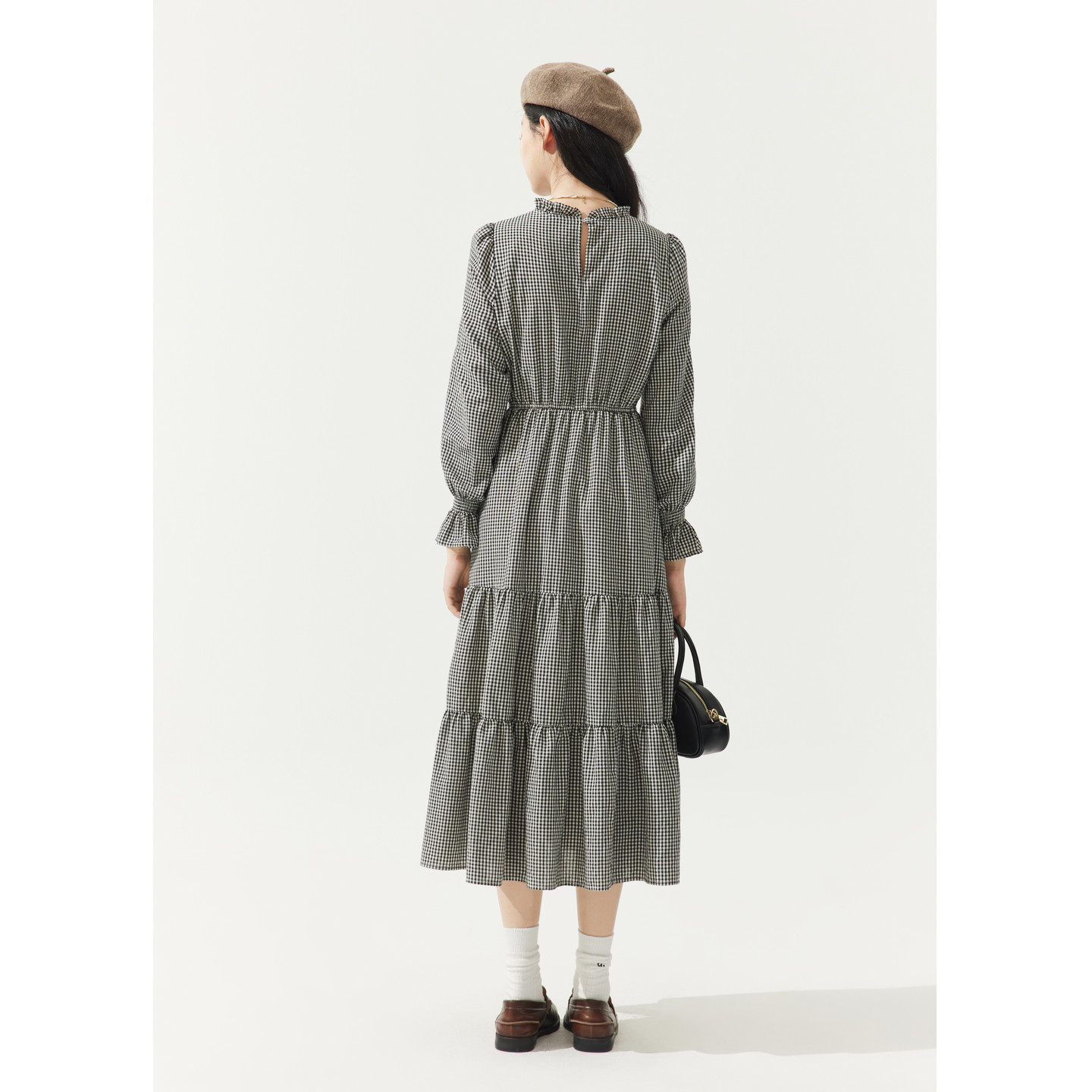 紫涵黑白格纹收腰连衣裙女秋季新款甜美日系简约花边长袖立领长裙